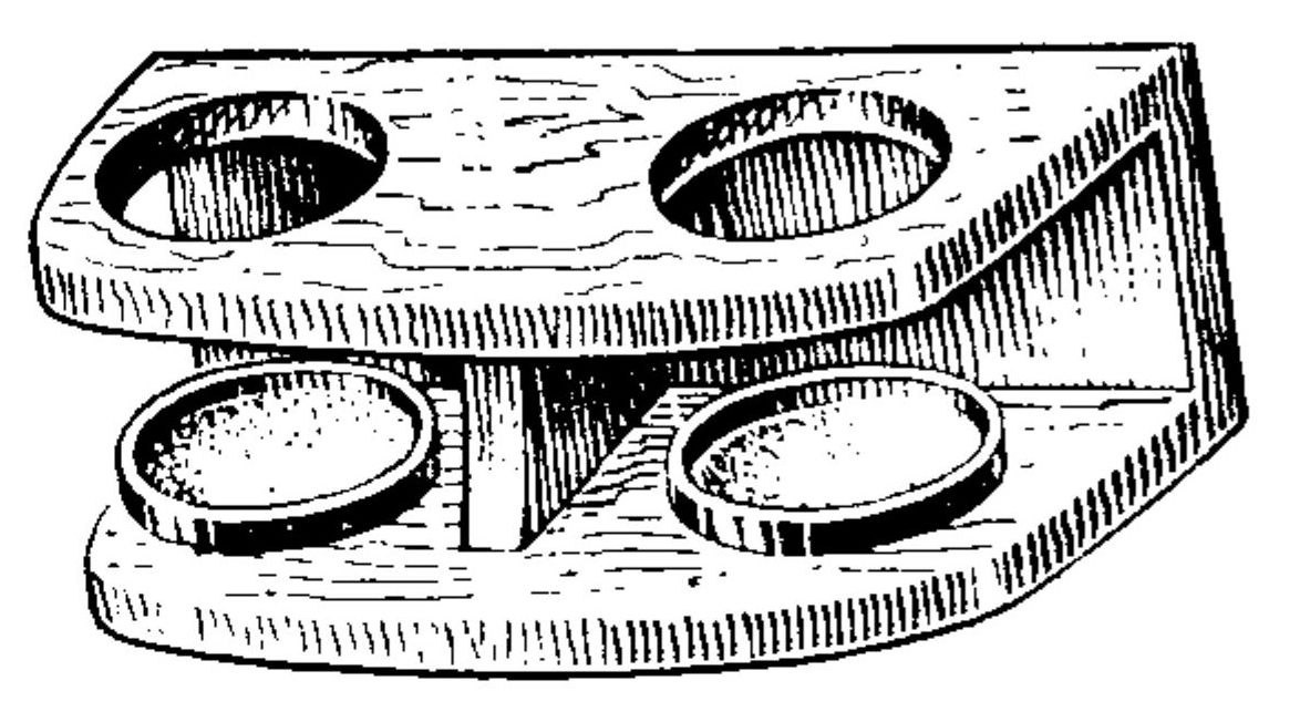 Полезные мелочи ПОЛОЧКА ДЛЯ БИНОКЛЯ Во время похода бинокль чаще всего хранят в кожаном чехле — на полке среди штурманских принадлежностей или где-нибудь поблизости от сходного люка. Чтобы гарантировать бинокль от падения во время сильного крена или ударов с переборки, советуем сделать простую по конструкции полочку-гнездо, которую можно закрепить на переборке непосредственно у выхода на палубу. Полочка состоит из двух фанерных планок, скрепленных вместе через деревянный брусок. В верхней планке нужно вырезать отверстия под объективы, к нижней — приклеить штатные пластмассовые крышки от бинокля. Размеры следует выбирать по конкретному биноклю. ⚓️ Мотолодки, катера и яхты