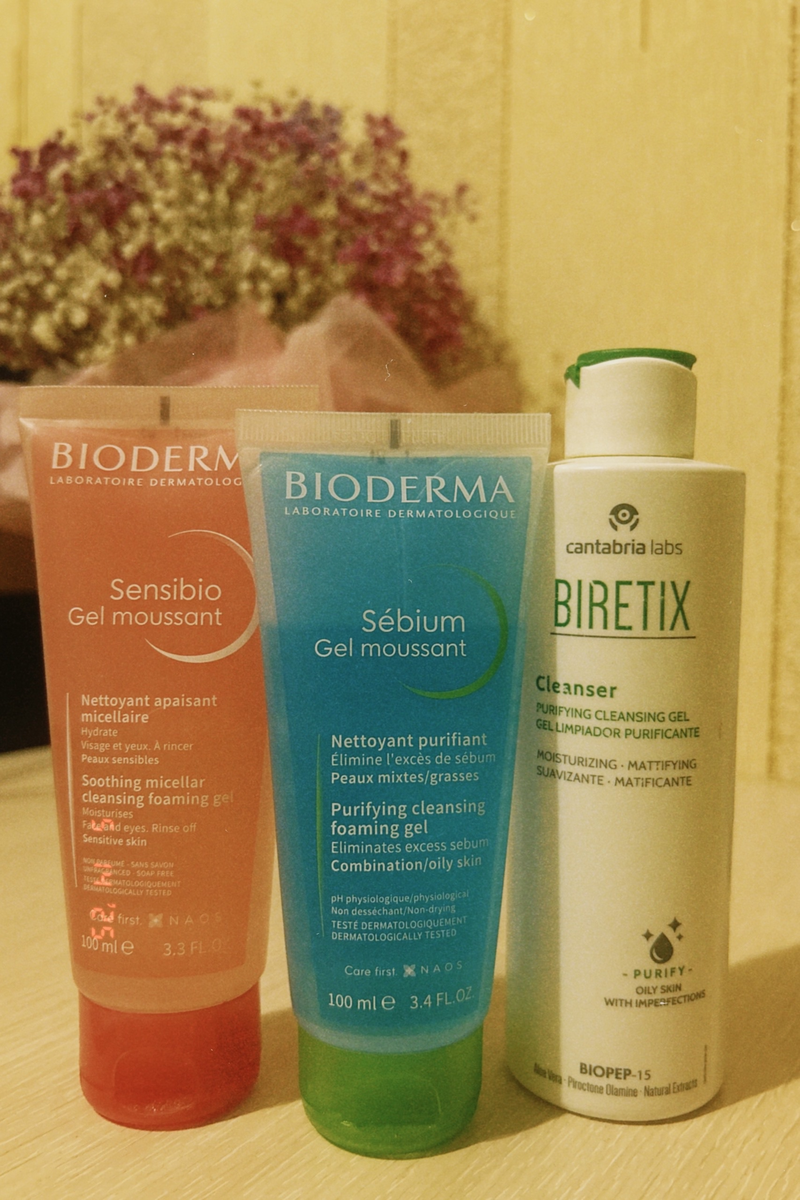 Итак, все мы знаем, что уход должен состоять из трёх этапов: очищение, тонизирование и увлажнение. Обещала Вам рассказать про свои хитрости. Так вот, первый этап, он же очищение гелями/пенками/муссами и тд, я применяю только вечером перед сном, когда наша кожа весь день была подвержена агрессивным факторам: ветер/солнце/дождь/мороз, а может быть, всё сразу. Тут ей просто необходимо очиститься от всего этого, чтобы она "задышала". Пользуюсь я гелем для умывания от российского бренда Bioderma (розовый - за чувствительной кожей, синий - для проблемной), а также гелем от Biretix (испанский бренд, очень нравится их продукция).