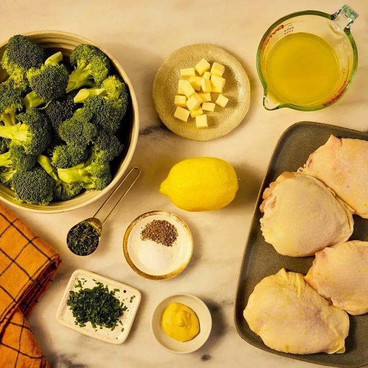 Ищете рецепт ужина, который сочетает в себе сочную курочку с хрустящей корочкой, нежную овощную гармонию и яркий лимонно-горчичный соус? Тогда вы попали по адресу! Это блюдо – воплощение простоты и изысканности одновременно. Оно готовится в одной сковороде (здравствуй, легкая уборка!), выглядит очень аппетитно и порадует вас сбалансированным вкусом. Идеальный выбор для буднего вечера, когда хочется и вкусно, и полезно. Время приготовления 45 минут (15 минут подготовка + 30 минут готовка) Куриные бедра (с кожей и костью) – 4 шт. (около 170 г каждое) Соль – 1/2 ч. л. (разделить) Молотый черный перец – 1/2 ч. л. (разделить) Лимон средний – 1 шт. Брокколи – 450 г (нарезать на соцветия ~2,5 см) Куриный бульон (несоленый) – 160 мл (2/3 стакана) Горчица дижонская – 2 ч. л. Петрушка свежая (плосколистная, рубленая) – 1 ст. л. Тимьян свежий (листочки) – 1 ч. л. + немного для украшения Масло сливочное (несоленое, холодное) – 2 ст. л. (нарезать кубиками) Разогрейте духовку до 220 градусов. Кур