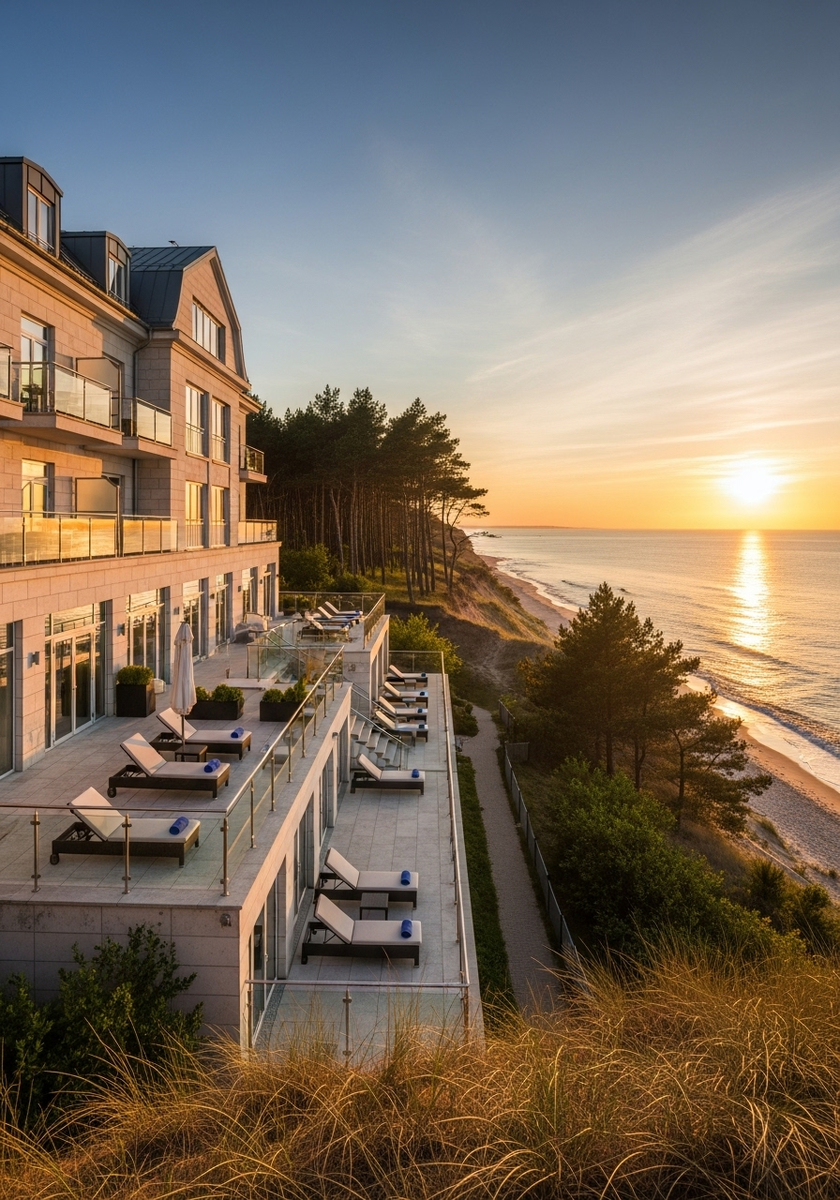 Роскошный пятизвездочный отель расположен в историческом здании бывшего охотничьего домика прусского короля на берегу Балтийского моря. Находится в окружении векового парка Беккера, всего в 300 метрах от широкого песчаного пляжа с международной наградой «Голубой флаг».