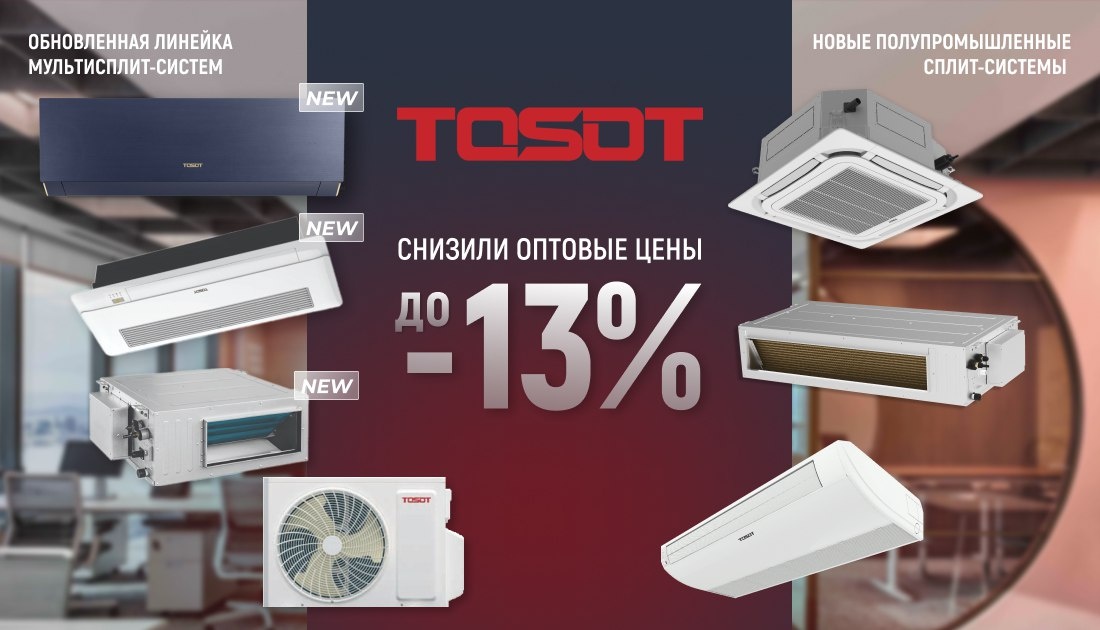 МЫ СНИЗИЛИ ОПТОВЫЕ ЦЕНЫ ✅ на новую линейку инверторных полупромышленных кондиционеров TOSOT ✅ на мультисплит-системы TOSOT Важными преимуществами полупромышленных сплит-систем TOSOT являются применение технологии FULL DC Inverter и ЭРВ (электронный расширительный вентиль), а также переход на экологичный хладагент R32 и настенный пульт управления со встроенным Wi-Fi-контроллером. В 2025 году модельный ряд внутренних блоков мультисплит-систем TOSOT FREE MATCH EURO пополнился новинками: кассетным однопоточным блоком, канальным средненапорным блоком и настенным Clivia Deluxe! Данное оборудование сейчас в наличии на складе – успейте его приобрести со скидками до -13%. 🖥 Оформить заказ можно у вашего персонального менеджера или на https://klimatprof.online/catalog/?brand=112