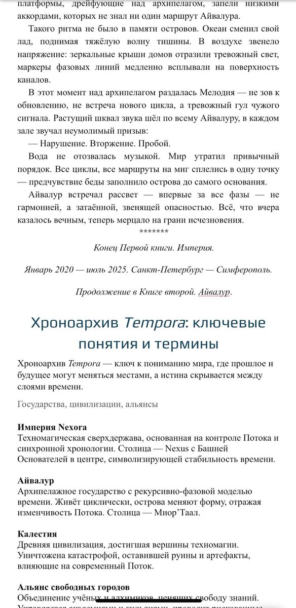 ✨ Друзья, это случилось. Я закончил первую книгу. «Время. Империя» — готова. Финальная точка поставлена. Герои сказали всё, что должны были. Остался последний этап: вычитка и обложка. Это был длинный путь. Сотни часов, правки до рассвета, переписанные главы, сражения с текстом — и с собой. И вот — завершающая страница, где Айвалур встречает тревожный рассвет, и мир Tempora начинает новую фазу. Спасибо тем, кто был рядом, кто читал, поддерживал, просто верил. 📖 Продолжение будет — во второй книге. Уже дышит Айвалур. А пока — дайте себе время. Я дал его себе. 31.07. 2025 отправка на модерацию.