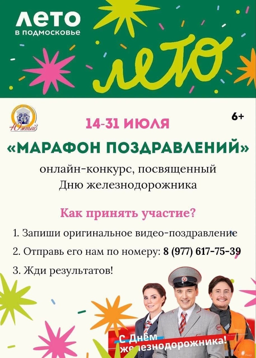 ✨ 🌟 Дорогие друзья! 🌟 Так же мы рады объявить о старте онлайн-конкурса «Марафон поздравлений», посвящённого Дню железнодорожника! 🚂✨ Этот конкурс — прекрасная возможность выразить признание и благодарность тем, кто ежедневно обеспечивает надежное и безопасное движение поездов. Приглашаем всех присоединиться и поделиться своими теплыми словами, вдохновляющими стихами или креативными поздравлениями! 📝💖 Не упустите шанс отметить труд железнодорожников! 🛤️ 🏆 Участвуйте и дарите радость! ✳️Работы принимаются до 31 июля 🚫 Возраст: 6+ 🏢 Городской дом культуры «Южный» 📍 г.о.Домодедово, мкрн.Барыбино, ул.Южная, стр1А ✅ Мероприятия Домодедово https://dzen.ru/id/66f10385cc4c5a16f7b5fb02 http://vk.com/domodedovo_events http://dzen.ru/domodedovo_events