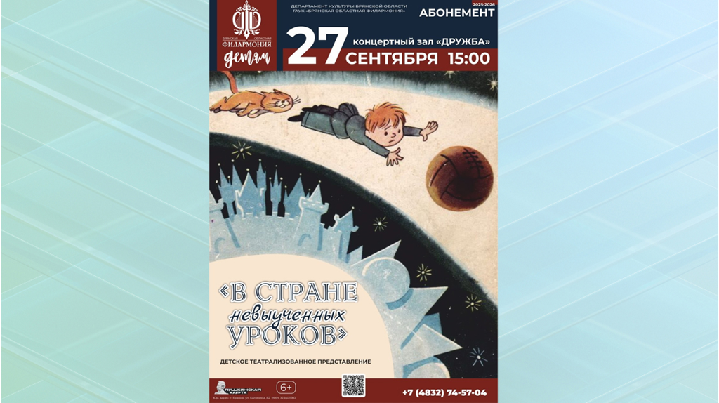 На сцене концертного зала "Дружба" покажут детское театрализованное представление «В стране невыученных уроков». Оно пройдет в субботу, 27 сентября. Начало в 15:00. Программа создана по мотивам повести Лии Гераскиной и рассказывает о волшебном путешествии четвероклассника Виктора Перестукина, во время которого он весело проводит время, исправляя свои ошибки и получая новые знания. Увлекательный сюжет, вокальные и хореографические номера с участием артистов Брянской областной филармонии порадуют детей и взрослых. В программе – всеми любимые музыкальные композиции известных советских и российских композиторов из мультипликационных фильмов. 6+ Юных брянцев пригласили в «Страну невыученных уроков»
