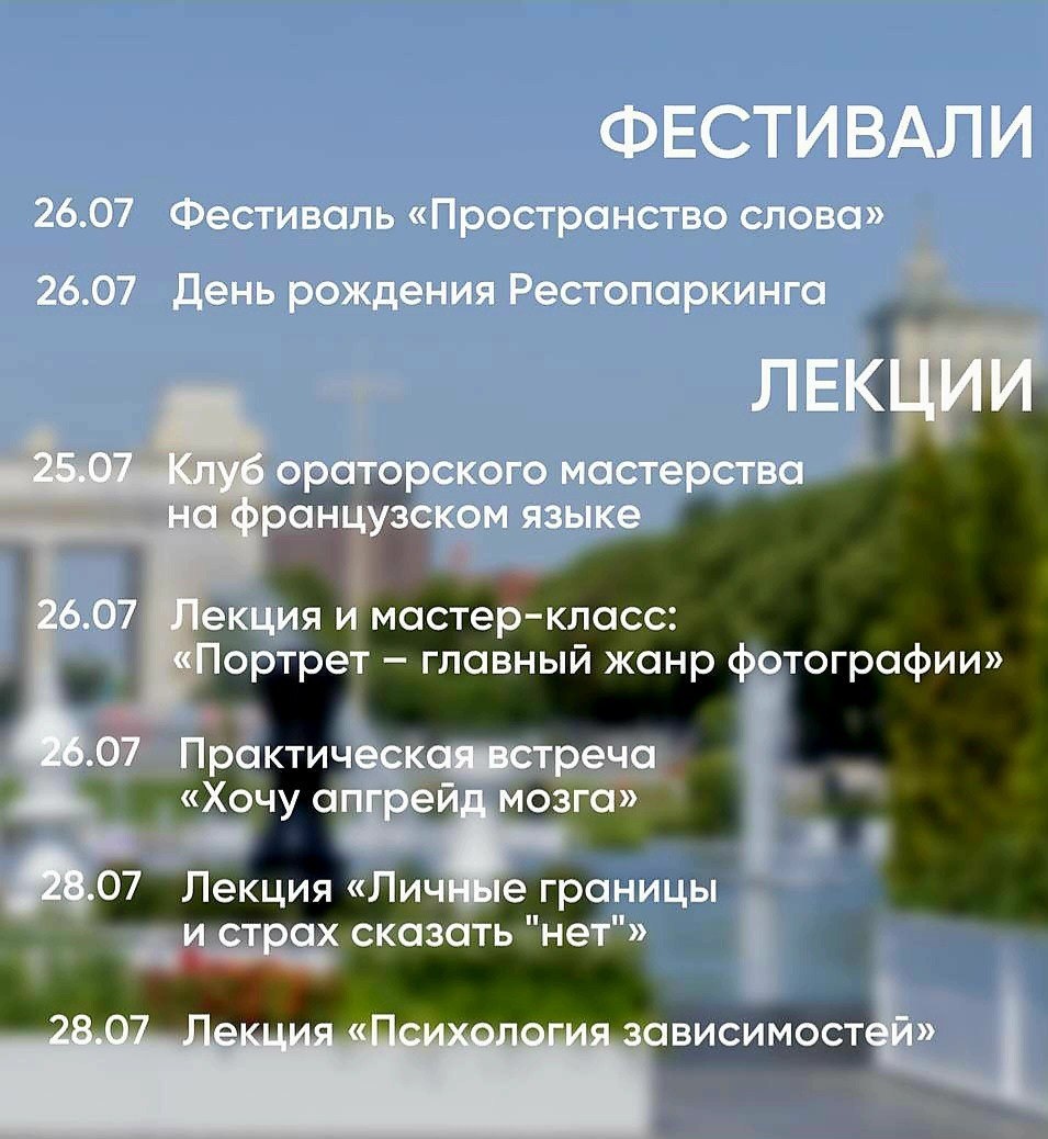 В Парке Горького на этой неделе:🗓 Фестивали ✅ 26 июля, с 11:00 — фестиваль «Пространство слова» на Крымской набережной ✅26 июля — день рождения Рестопаркинга (5 лет) 16:30 — 17:30 — анимационное шоу для всей семьи «Назад к динозаврам» 18:00 — 18:40 — детское шоу сладкой ваты 19:00 — 20:00 — выступление кавер-группы «V.S.E.» 20:00 — 22:00 — DJ-сет Лекции ✅Клуб ораторского мастерства на французском языке ✅Лекция и мастер-класс: «Портрет – главный жанр фотографии» Проект «Психолог в парке» ✅Практическая встреча «Хочу апгрейд мозга» ✅Лекция «Личные границы и страх сказать "нет"» ✅Лекция «Психология зависимостей»