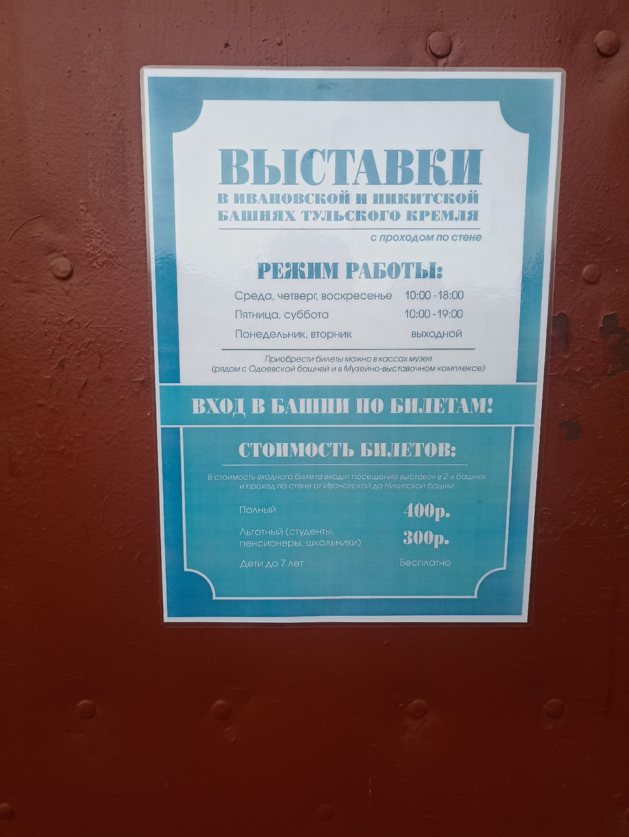 Итак, вход в Ивановскую и Никитскую башни Тульского Кремля открыт в: