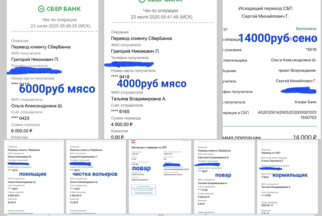 Здравствуйте, дорогие друзья 💗 Спасибо вам за помощь и поддержку, спасибо, что вы рядом! На завтрашнее утро нам надо срочно собрать на корм, дрова и зарплаты работникам!🙏 Друзья, дрова и корм у нас практически закончились. Со сборов сегодня мы оплатили: ▪︎14.000руб за 4рулона сена, которое привезли вчера для подстилки в клетках. ▪︎ 10.000руб оплатили за доставку мясного, оно приехало в приют. ▪︎ 4.800руб за чистку 48 вольеров (летники). ▪︎ оплатили 10.000руб за работу 2 ночным поварам. ▪︎ оплатили за вчерашний день 1 кормильщику 3.000руб и 1 поильщику 3.000 руб. Огромное спасибо Эльвире Степановне - она адресно вчера перевела на оплату вчерашним двум поварам 10.000руб🤝 ▌ Приют «Возрождение»: место, где оживают мечты наших четвероногих друзей Просим дочитывать наши статьи до конца, ставить лайки, смотреть видео! Репостить наши статьи! 📦 Вы так же можете помочь прямо сейчас! Отправьте корм или другие нужные вещи через Ozon или Wildberries — ваши заказы спасают животных от голод