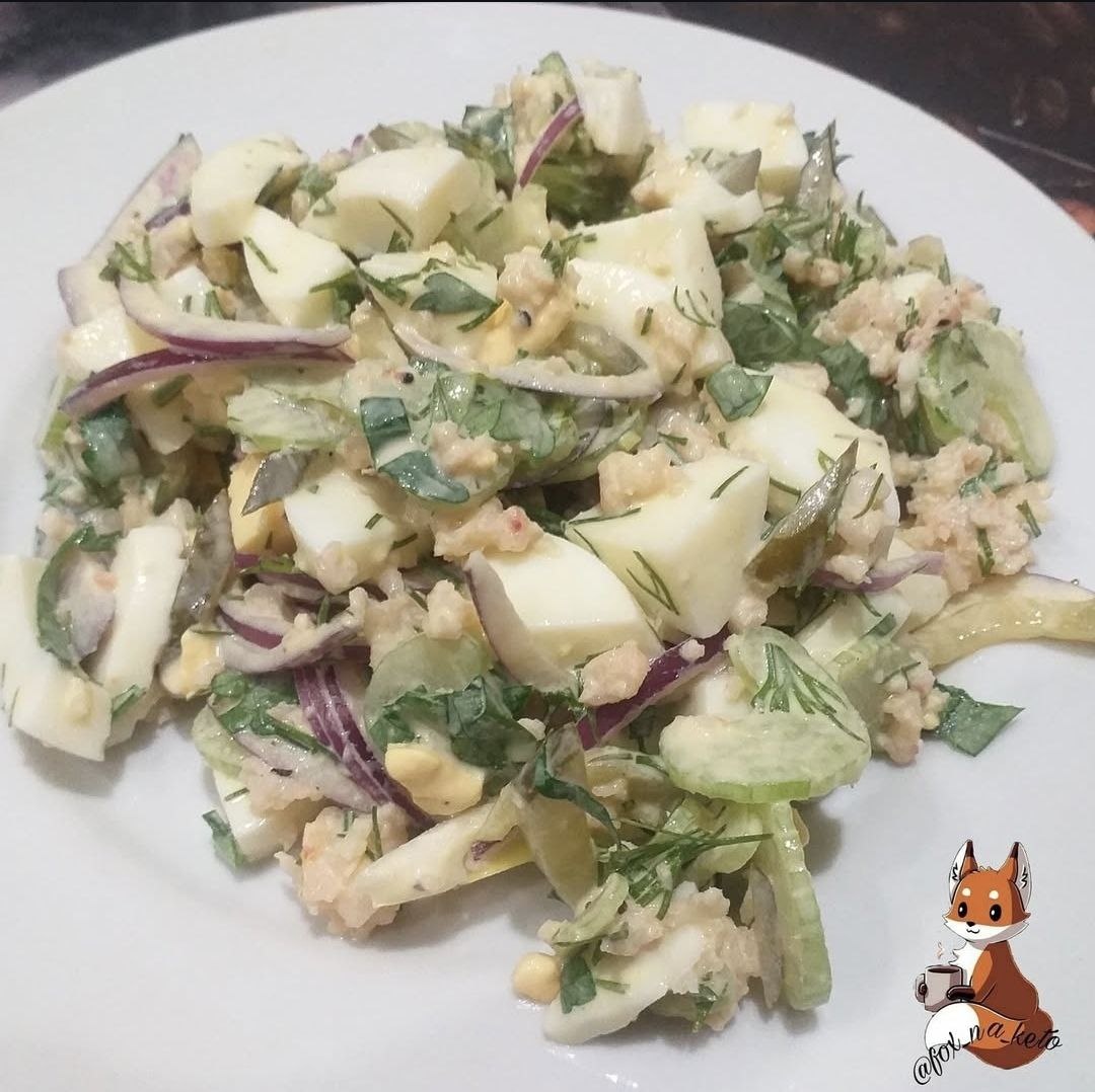 САЛАТ "ЯИЧНЫЙ" Ингредиенты: 📌 яйца варёные 3 шт 📌 стебель сельдерея 2 шт 📌 солёный огурчик 1 шт 📌 зелень 1/2 пучка 📌 лук красный 1/2 небольшой головки 📌 мясо криля 1 б или 100 гр креветок 📌 майонез домашний 2-3 ст.л. Приготовление: Сельдерей и лук порезать тонкими пластинками, огурец- соломкой, яйца крупными кусочками, зелень измельчить. С мяса криля слить жидкость, размять вилкой, если креветки, то порезать на 4 части и можно еще обжарить. Добавить майонез, хорошо перемешать. ПРИЯТНОГО АППЕТИТА