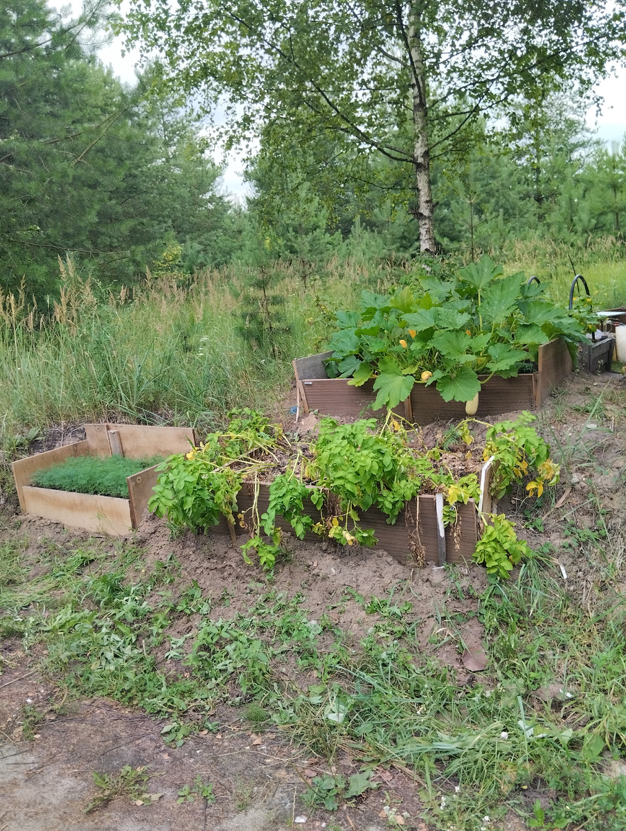 Привет, друзья! Я с понедельника хожу прохожу плановое лечение в дневном стационар при нашей поликлинике. Стационар находится в сосновом лесу, тут условия как в санатории. На территорию просто так не пройдешь и не приедешь, обязательно нужен пропуск, есть пункт охраны. Так вот, один из охранников развел со стороны въезда в стационар мини огород. Там несколько высоких грядок у него построено разной высоты и растет там, на его огородике картошка, кабачки, тыквы, помидоры, зелень . Вы только посмотрите на этот укропчик- такие стройные ряды отличной зелени. Картошка замульчирована опилками и травой. Чуть подальше стоит несколько грядок с зеленью, с краю петрушка растет, остальное я не видела. Вот такой охранник-вахтер-огородник в одном лице. Молодец! А что? Сорвет кабачок, пожарит в своей сторожке , сверху укропчиком посыплет и наелся! На таком маленьком клочке земли развел такой огородик, любо дорого посмотреть, причем без отрыва от основной работы. С днём огородника, кстати, всех п