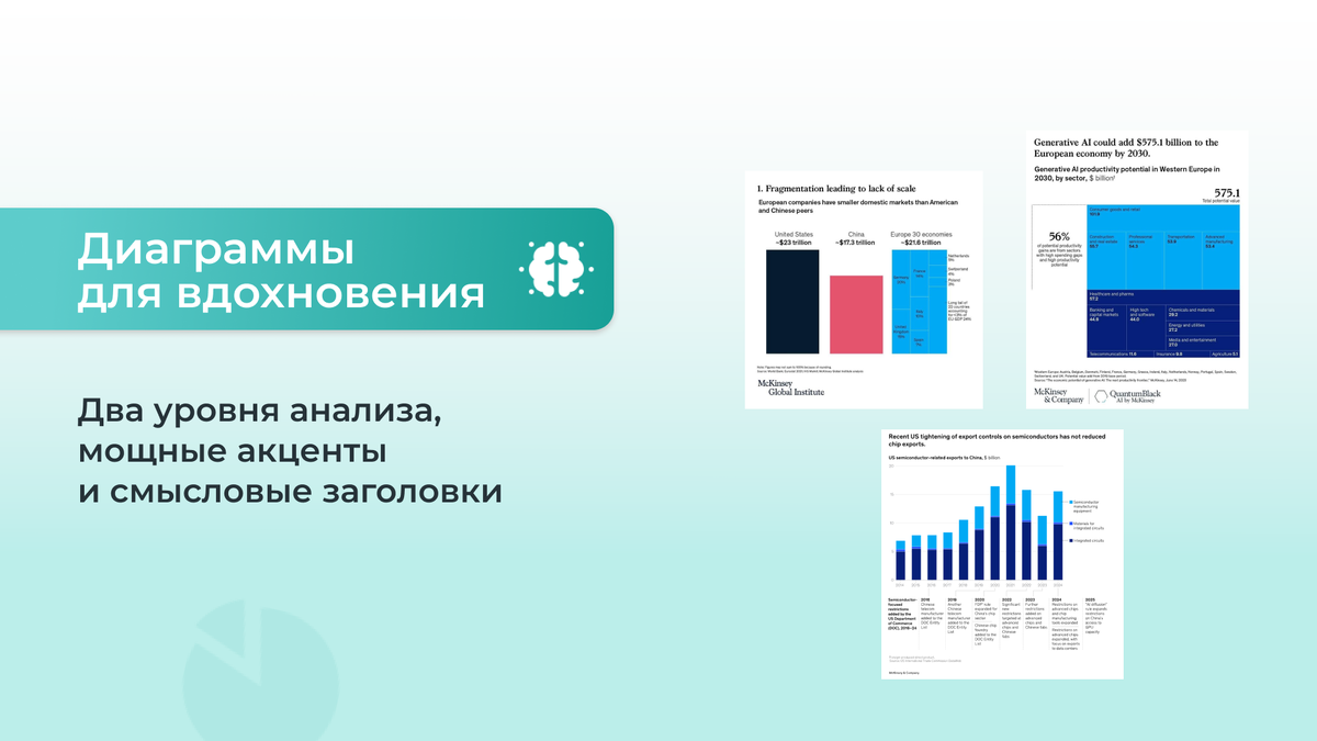 Если ищете интересные идеи для визуализации данных, то у McKinsey много чего можно подглядеть — их отчеты настоящая сокровищница дизайн-решений. Три крутых примера того, как можно выйти за рамки стандартного применения диаграмм: Блестящее решение от McKinsey! Сравнили три региона классическими столбцами, но для Европы детализировали столбец диаграммой Дерево. Получили два уровня анализа в одной визуализации — и общее сравнение, и разбивку по европейским странам. Здесь показали, как цифры могут работать на заголовок. Крупные числа в блоках не просто украшение — они усиливают главный посыл диаграммы о потенциале ИИ в $575 млрд. Третий пример про экспортные ограничения на полупроводники — под осью времени разместили ключевые события и решения. Теперь видно не просто динамику цифр, а почему они менялись. Смысловые заголовки — каждый заголовок не просто называет тему, а сразу дает главный инсайт. Аккуратная верстка — четкая структура, продуманная иерархия, все элементы на своих местах. Ниче