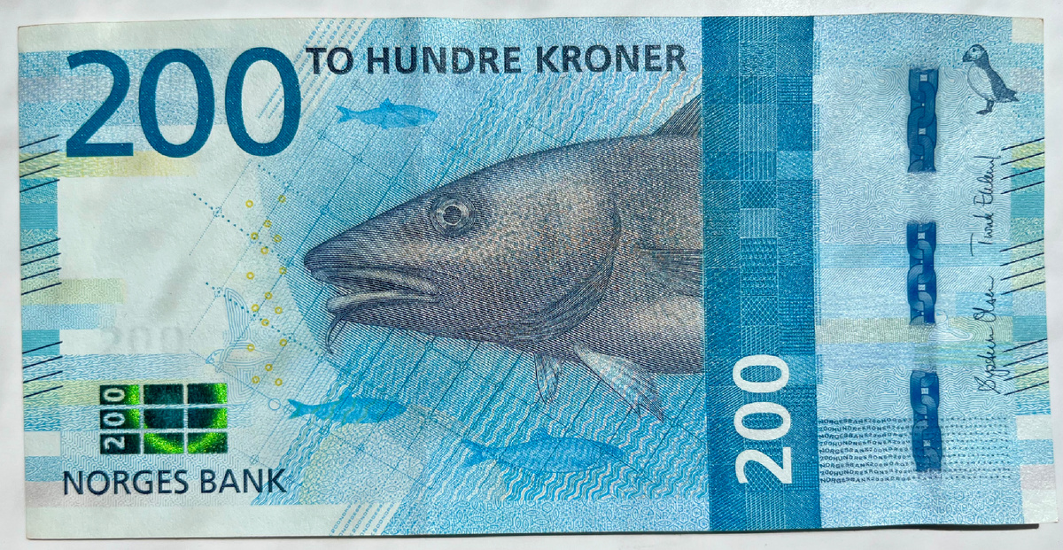 В 2016 году Норвегия представила обновлённую серию банкнот, и особое место среди них заняла купюра номиналом 200 крон. Центральный элемент дизайна этой банкноты — величественная треска, рыба, которая веками кормила норвежский народ и до сих пор играет ключевую роль в экономике страны. Лицевая сторона купюры рассказывает историю морского промысла через образ этой удивительной рыбы. Обратная сторона дополняет повествование, показывая рыбацкий бот на горизонте, раскинутую рыболовную сеть и навигационный знак, качающийся на волнах. Выбор трески для изображения на банкноте не случаен. Именно в поисках богатых рыбой вод первые поселенцы пришли на норвежское побережье более 11 тысяч лет назад. Сегодня треска остаётся важнейшим продуктом для прибрежных поселений, особенно на крайнем севере страны. Только за 2015 год Норвегия экспортировала трески на сумму около 873 миллионов евро. Дизайн банкноты выполнен в спокойных голубых тонах, что гармонично сочетается с морской тематикой всей серии. Э