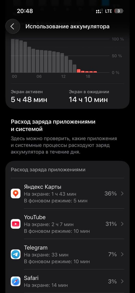 Снял с зарядки в 22:56 и активно пользовался до 06:00 утра, а потом с 12:00. В итоге в 20:48 оставалось 3%.