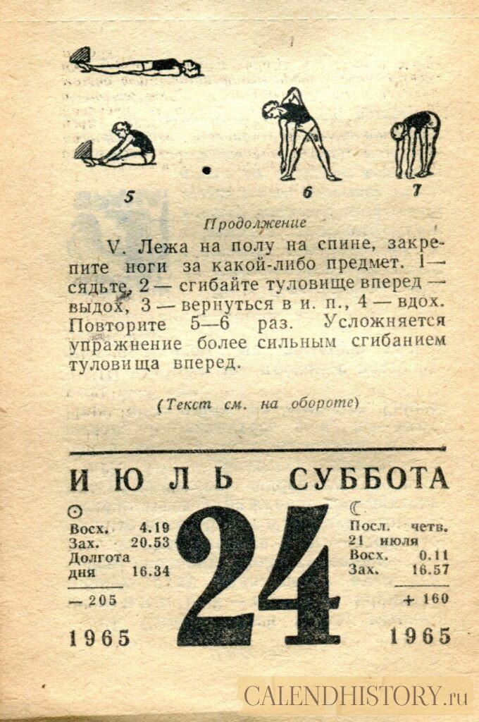 Итак, сегодня 24-го июня и у нас на календаре 1965-й год. Перед нами листок советского календаря для женщин. На календаре у нас суббота - 24 июня 1965-го года. ГИМНАСТИКА ДЛЯ ЖЕНЩИН В ВОЗРАСТЕ 40—55 ЛЕТ Лежа на полу на спине, закрепите ноги за какой-либо предмет. 1— сядьте, 2 — сгибайте туловище вперед — выдох; 3 — вернуться в и. п., 4 — вдох. Повторите 5—6 раз. Усложняется упражнение более сильным сгибанием туловища вперед. *** Оборотную сторону листка этого календаря можно посмотреть у нас по ссылке на сайте. Заходите на наш интересный сайт об отрывных календарях. Другие листки советских календарей смотрите у нас на сайте - CALENDHISTORY.ru ПОСМОТРИТЕ ЕЩЁ ЛИСТКИ ОТРЫВНЫХ КАЛЕНДАРЕЙ:
