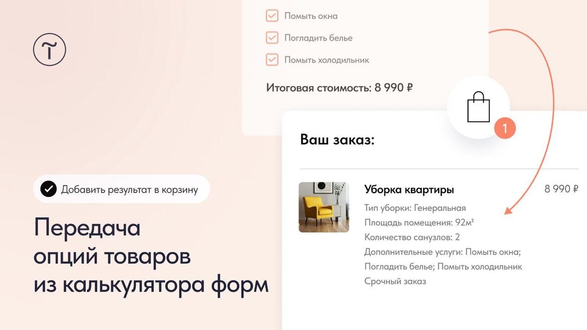 🧮 Передача опций товаров из калькулятора форм Теперь значения из полей формы отображаются в корзине как опции товара. Например, для финальной стоимости по услуге уборки квартиры нужно рассчитать площадь помещений и количество комнат через калькулятор. Пользователь указывает нужные данные: 2 санузла и общая площадь для уборки — 92 м². Эти данные отобразятся в корзине и в заказах как опции товара. Чтобы добавить полученный результат калькулятора из формы, перейдите в Контент блока. Далее, в поле «Калькулятор» поставьте галочку напротив пункта «Добавить результат в корзину». Также заполните поле Название в корзине, перечислите Опции в корзине и загрузите изображение при необходимости. Расчёт опций товаров будет работать во всех формах, в том числе в Zero Block. 🆗 Это будет полезно, когда у вас на сайте есть форма с калькулятором, например, для расчёта количества часов на обучение или финальной стоимости весового товара. Покупатель перед оформлением заказа сможет перепроверить данные