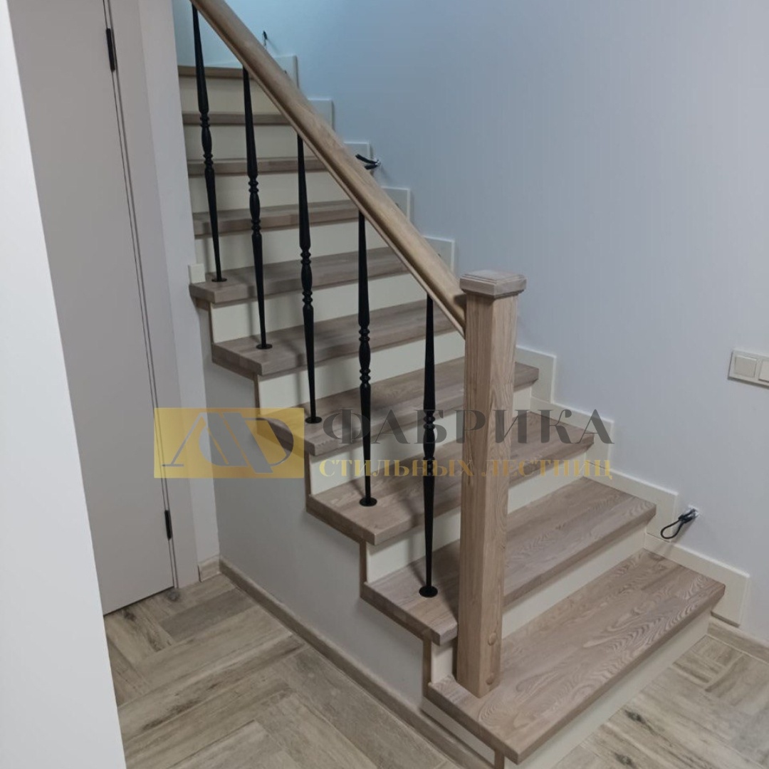 🔒 Внутренняя лестница закрытого типа с площадкой: тишина, стиль и надёжность Если вы ищете лестницу, которая будет не просто соединять этажи, а станет полноценной частью интерьера — этот вариант стоит вашего внимания. Закрытый тип конструкции, надёжный ясень, площадка для безопасного поворота, утончённый цвет «дуб белёный» и контрастные балясины — всё продумано до мелочей. Такая лестница выглядит дорого, звучит тихо и служит десятилетиями. Что такое закрытая лестница с площадкой? Закрытая лестница — это когда подступенки (вертикальные элементы под ступенью) полностью закрывают просвет между ступенями. Такой тип конструкции: Площадка — это горизонтальная зона между маршами. Особенно удобна для поворота лестницы в условиях ограниченного пространства. Её любят за: Материалы и оттенки: продуманная классика Для этого проекта мы выбрали ясень — прочный, благородный и износостойкий материал. Он отлично выдерживает нагрузку, хорошо шлифуется и идеально принимает тонировку. По эксплуатацио