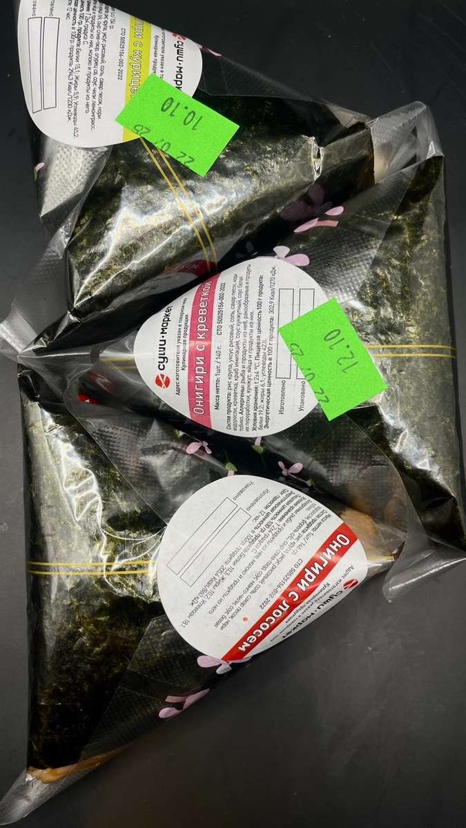 Всем привет, дорогие друзья. Не так давно я уже рассказывал про роллы из необычного заведения “СушиМаркет”. Кратко, там есть очень неплохие роллы за очень мало денег. Вкус средний, но цена просто чудо. Помимо роллов, в меню есть ещё онигири и слоеные салаты — трайфл. Слово забавное, конечно. Вроде как, всем привычная мимоза, даже если её запихнуть в такой стаканчик, так и останется слоёным салатом. Но если сделать это с лососевыми, креветкой, рисом и другими ингредиентами для роллов, то это уже трайфл. Правильно я понимаю? Собственно, сегодня расскажу про онигири. Всего их 4 вида, с лососем, лососем терияки, курицей и креветкой. Мы попробовали три из них. Расскажу про каждый. Самая первая позиция, которую я попробовал. Собственно, именно из-за неё я и захотел попробовать остальные, ведь это просто топ за свои деньги! Цена — 145 рублей за штуку. Вес — 146 грамм. Состав: Рис, лосось слабосоленый, соус манго-чили, сыр сливочный, соус белая тобика, нори. Рыбы много. Для так
