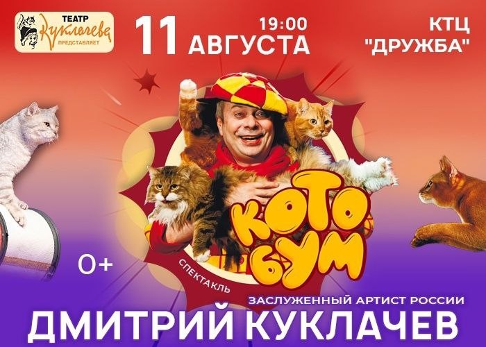 🎭 Добро пожаловать в волшебный мир Театра кошек Куклачёва! 🌟 Главное семейное событие сезона — спектакль «Кото Бум»! Представьте: два озорных хулигана, спасаясь от полиции, случайно попадают в загадочный и волшебный мир, где живут... кошки! Но это не просто кошки — это пушистые наставники с добрым сердцем, которые с любовью и терпением помогают героям увидеть в себе лучшие качества. Именно здесь, среди мурчащих артистов, начинается настоящее преображение: на смену хулиганству приходит дружба, искренность и свет. 🐾 40 настоящих кошек на сцене! Каждая из них — звезда, которая умеет удивлять. Вас ждут невероятные трюки, волшебные превращения, цирковые номера, а главное — душевная история, наполненная теплом, смехом и настоящим чудом. 👪 Для детей и взрослых — это спектакль, на который хочется прийти всей семьёй. Ведь «Кото Бум» — это больше, чем представление. Это напоминание о том, как важно быть добрее, заботливее и внимательнее друг к другу. ⭐️ В ролях: Дмитрий Куклачёв, Марина