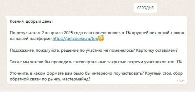 Ребята, ну день просто сумасшедший! Сначала открыли регистрацию на самый красивый веб по Midjourney, а потом — БАЦ — 📩 «Вы в 1% крупнейших онлайн-школ на GetCourse». Я как сидела с кофе, так чуть его не расплескала. Спасибо вам. Вы — мой движ! Каждый ваш «огонь» под постом, каждый вопрос, каждое «а как это работает?» — всё это огромная часть школы! Давайте закидаем нас всех ❤️! Спасибо!!!