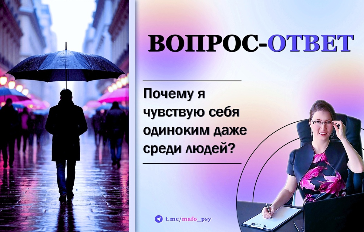 «Почему я чувствую себя одиноким даже среди людей? Вроде бы вокруг друзья, коллеги, даже семья, но внутри — пустота и ощущение, что меня никто не понимает. Будто я за стеклом: все вижу, но не могу присоединиться. Это ненормально?» – спрашивает Arthur. Это очень распространенное, но от этого не менее болезненное чувство — одиночество среди людей. Часто это ощущение возникает, когда есть разрыв между тем, что мы демонстрируем внешне, и тем, что происходит у нас внутри. Вы можете улыбаться и кивать, но при этом на самом деле чувствовать себя некомфортно. 1. Акцент на количество, а не на качество связей Человеку нужны не просто люди рядом, а глубокие, значимые связи. Если Ваши отношения поверхностны или Вы чувствуете, что Вас не понимают, не принимают таким, какой Вы есть, то даже в окружении большого количества людей можно ощущать себя изолированным. 2. Сравнение себя с другими В социальных ситуациях мы часто подсознательно сравниваем себя с окружающими. Кажется, что у всех остальных «в