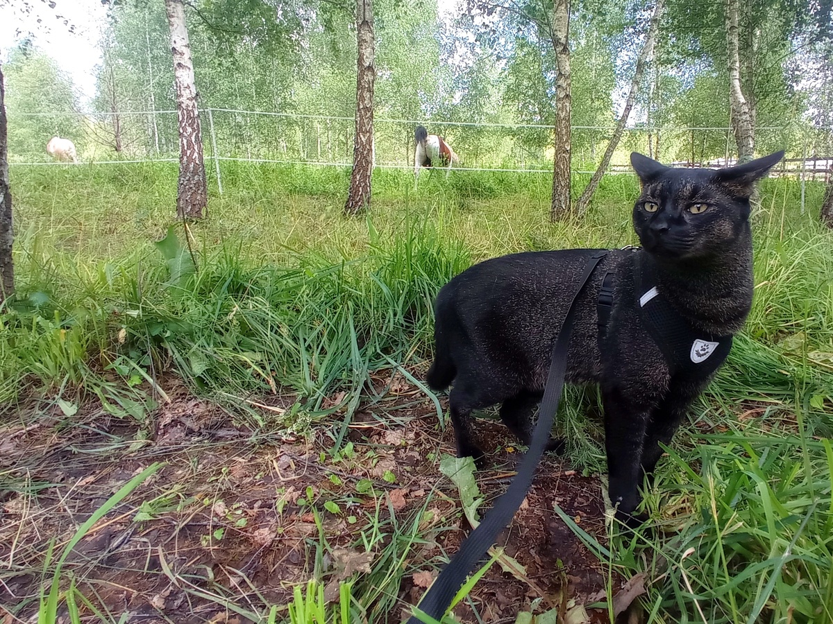 Отправились мы с Лимоном сегодня на прогулку. Дошли до элекропастуха, где паслись кони. К счастью, они гуляли вдалеке от нас, и у кота было достаточно времени оглядеться и обнюхаться, чувствуя себя относительно безопасно. А потом, когда мы отошли метров на 10, нас заприметил Чино. У забайкальца, должна сказать, какой-то повышенный интерес к Лимону. То ли потому, что новый зверь, то ли потому, что очень необычный. К просто кошкам Чино проявляет гораздо меньше внимания. Точнее, он их практически игнорирует, если только они не лезут к нему под ноги. Тогда конь может разозлиться на мелюзгу, снующую под копытами. У Лимона же интерес ровно противоположный: скорее сбежать от этого монстра, который прямо-таки бежит обычно нам на встречу, когда мы с котом гуляем. Более того, первая встреча, подарившая чаузи, я уверена, незабываемый опыт, научила его тому, что лучше держаться на расстоянии от такого чудища. Напомню: ничего страшного не произошло, но Чино проявил очень сильный интерес к Лимону и