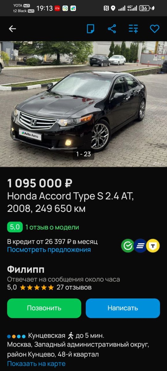 Сегодня осмотрели Honda Accord Type S 2008 г. 2.4 л. 200 л.с. У машины зелёная автотека. По факту, почти вся крашена, все четыре арки с ремонтомами + ремонт заднего правого проема двери. Не работает кондиционер. Передний бампер не оригинальный, зазоры нарушены. Из плюсов: мотор работает штатно, новая цепь. По коробке и подвеске вопросов нет. Салон сохранился хорошо. По диагностике ошибок нет. Выглядит хорошо. Автотека👇 Отчёт об истории авто. JHMCU26609C216306 https://www.avito.ru/autoteka-report/RU1eUFFWYCyfW01ri4u5MF?reportBodyOnly=1&fromSource=androidSharing Цена в объявлении 1.095.000 р. Цена после торга 1.000.000 р. К покупке не рекомендована. Связь 89017009095