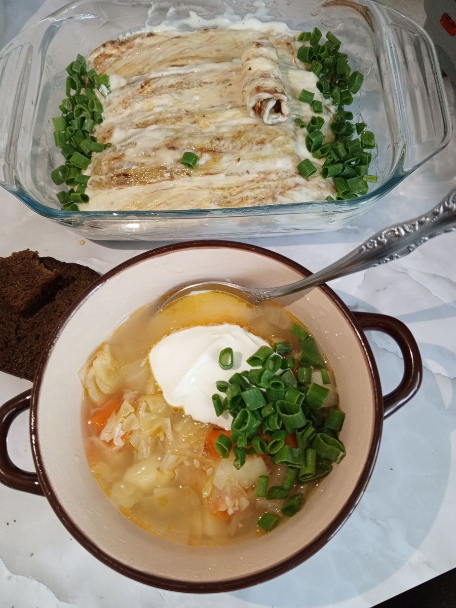 Щи из свежей капусты и зелёного горошка. В целом варить как обычные щи, в конце варки добавить зелёный горошек. Идеально будет если горошек замороженный, но у меня консервированный. И вода от горошка тоже в суп пошла. Интересный вкус, не стандартный. Вкусно! Подавать со сметаной и зеленью. Готовьте с удовольствием!#готовимдомавкусно