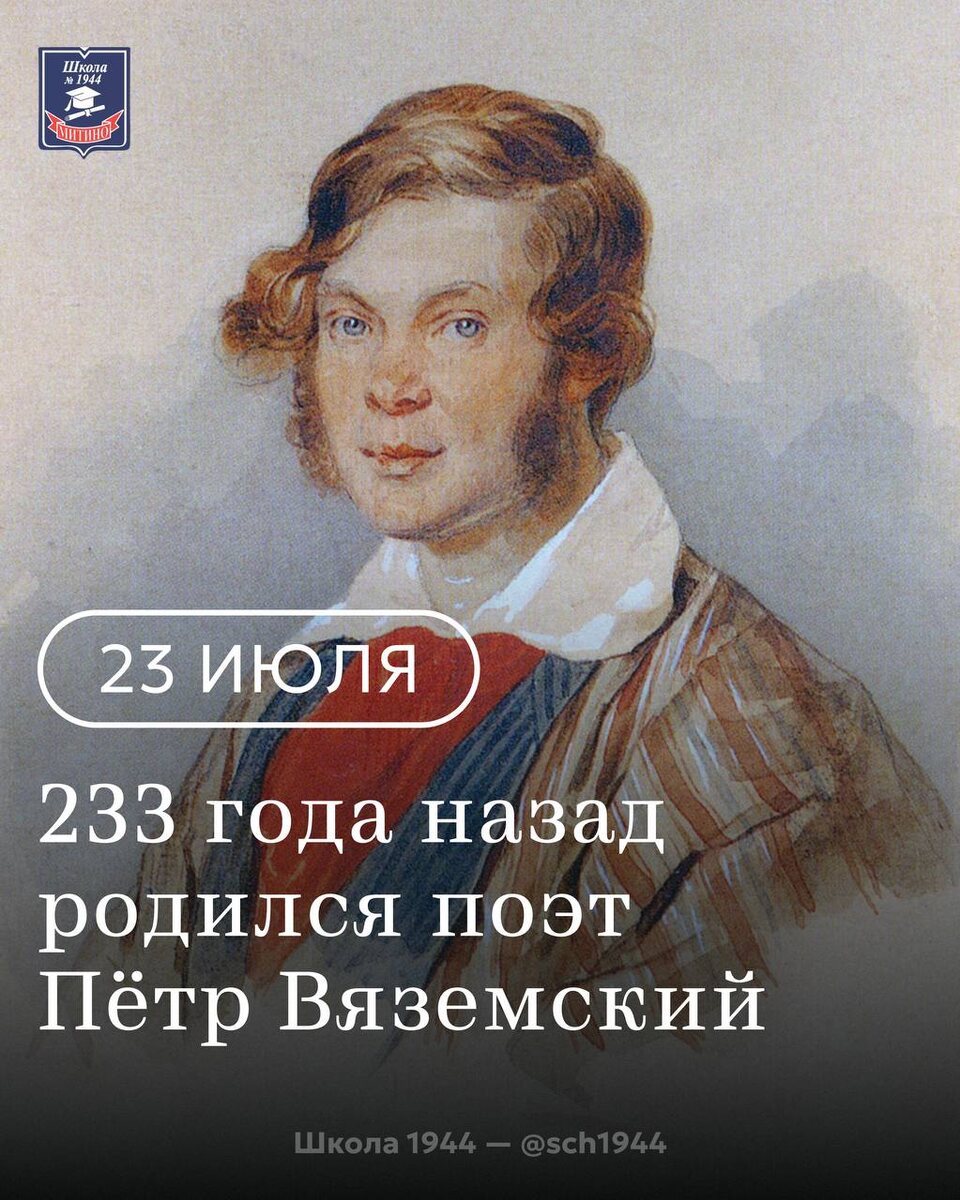 23 июля 1792 года родился Пётр Андреевич Вяземский ✍️ Его поэзия — гармоничная переправа между эпохой Просвещения и Золотым веком. Аристократ, высокоранговый чиновник и участник войны 1812 года, Вяземский был одним из самых популярных поэтов России 1820-х. Дожив до 1878 года, он застал уход многих своих великих современников. Поэт писал: Я пережил и многое, и многих, И многому изведал цену я; Теперь влачусь в одних пределах строгих Известного размера бытия. ▪️ Найдите и прочитайте сегодня что-нибудь из Вяземского — не пожалеете! #ДОНМ #ШколыКолледжиМосквы