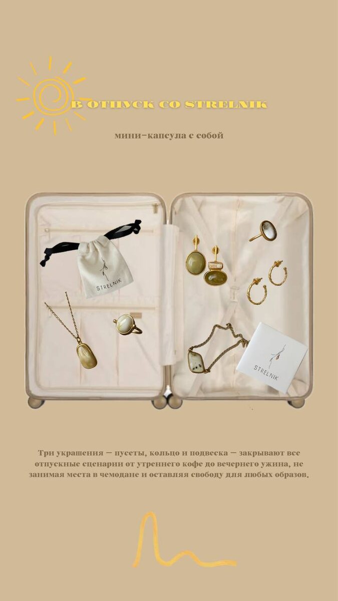 Планируете поездку, но не хотите брать с собой целый чемодан украшений? Соберите универсальную капсулу из трёх аксессуаров, которые впишутся в любой лук: 1. Серьги-пусеты – Мини-модель с янтарём или чистым металлом (из базовой коллекции без вставок) — на каждый день и под любую ситуацию. – Компактные, не займут много места и не создадут хлопот при досмотре. 2. Универсальное кольцо – Тонкое или в винтажом стиле, кольцо с аккуратной вставкой из янтаря — подойдёт и к пляжному, и к вечернему образу. – Легко комбинируется с другими кольцами, если захочется добавить акцент. 3. Подвеска на цепочке Лёгкая серебряная или позолоченная цепочка с янтарем подчеркнёт линию шеи и придаст образу свежести даже поверх простой футболки или платья. Подвеска добавит аккуратный акцент, не перегружая ваш отпускной гардероб. Делитесь в комментариях своими любимыми украшениями для поездки в отпуск!