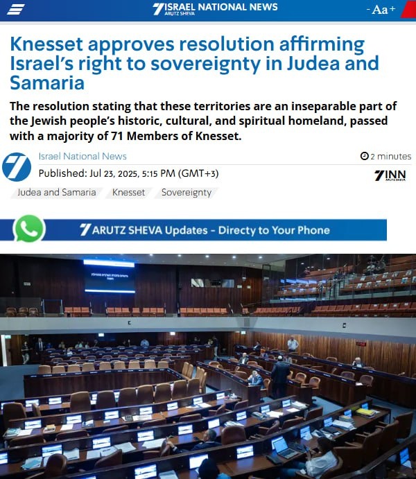Как сообщает Israel National News, «историческая» резолюция, в которой говорится, что эти территории являются «неотъемлемой частью исторической, культурной и духовной родины еврейского народа», была принята большинством в 71 голос депутатов Кнессета. В документе также подчеркивается: события 7 октября доказали, что создание палестинского государства представляет экзистенциальную угрозу Израилю и подрывает региональную стабильность. Кнессет подтвердил свою позицию о том, что идея палестинского государства снята с повестки дня, — говорится в публикации. Также сообщается, что Кнессет призвал правительство Израиля «как можно скорее приступить к работе по распространению израильского суверенитета, закона, юрисдикции и управления на все районы и формы еврейских поселений в Иудее, Самарии и долине реки Иордан». Западный берег реки Иордан должен был стать частью Палестинского государства, предусмотренного резолюцией №181 Генассамблеи ООН от 1947 года. С точки зрения Совета Безопасности ООН, те