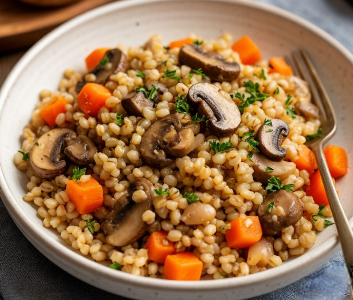 - 🥘 После обжарки перловую крупу осторожно перемещаю в форму для запекания к овощам и грибам, равномерно распределив всё ингредиенты.
