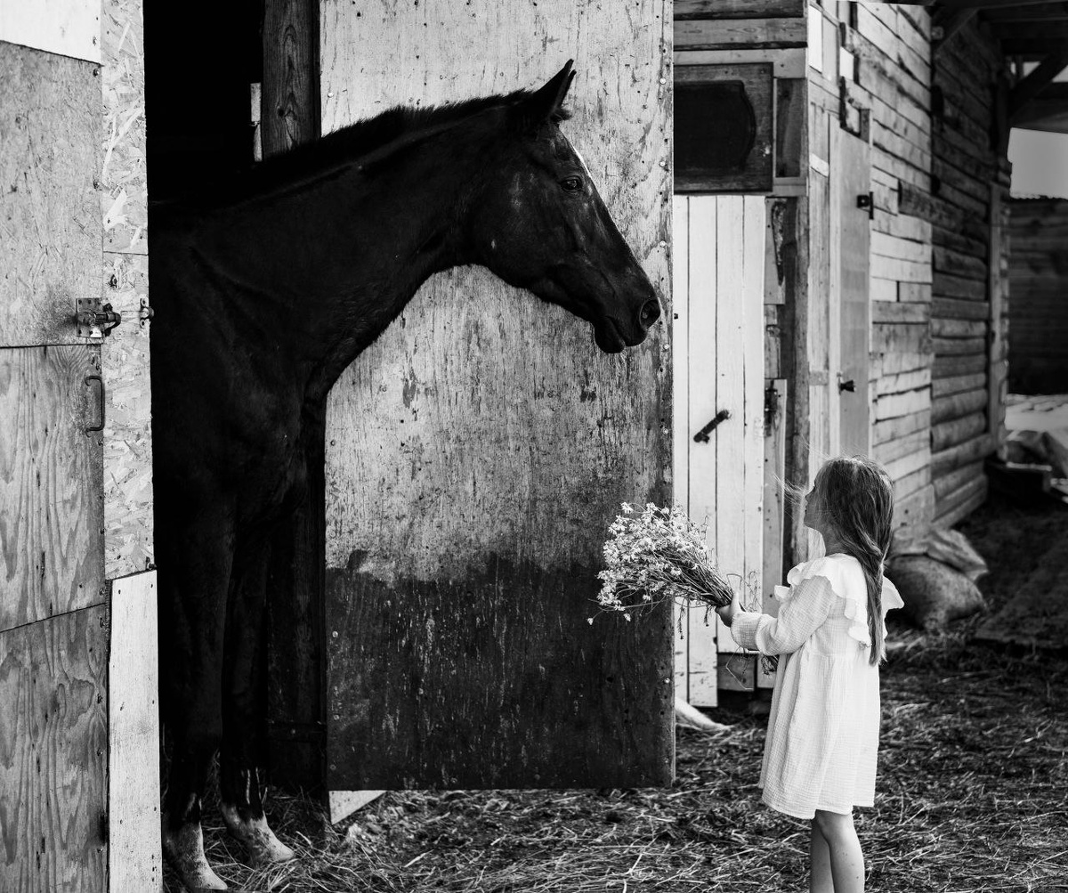 Как мне нравится этот кадр! Мне кажется, малышка принесла цветы коню как кинозвезде.