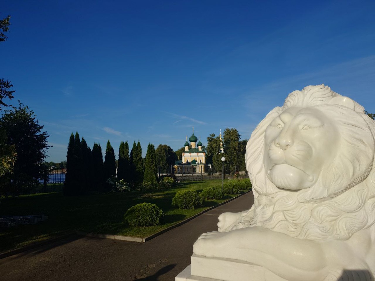Тут выпало пару дней плюс выходные - на море не улетишь, аэропорты плохо работают, остается нечто ближайшее доступное на машине. Углич. Были там весной на один день. Решили заехать еще раз с остановкой в Ривьере. Спа-отель с мраморными львами и чучелом медведя. Газпромовский отель, как сказал продавец шкатулок, дорого-богато. Да, хороший отель. С морской водой в бассейне и джакузи. Миленько так. Стоит прямо на берегу Волги недалеко от плотины. Ценник нормальный, плавающий.