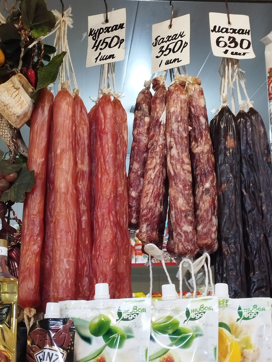 Первый как раз у прилавка с колбасами. Нет, ни курхан, ни махан, ни пахан я никогда не покупаю. Обычно беру немного отварной буженины или несколько сосисок.