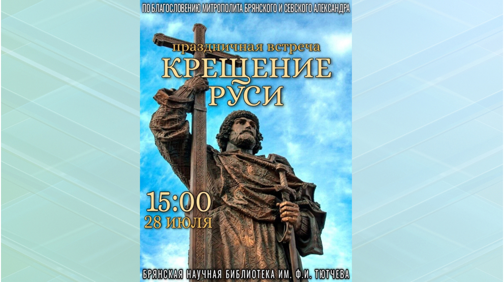 В Брянской областной научной библиотеке им. Ф. И. Тютчева 28 июля по благословению Митрополита Брянского и Севского Александра состоится праздничная встреча «Крещение Руси». Начало в 15:00.