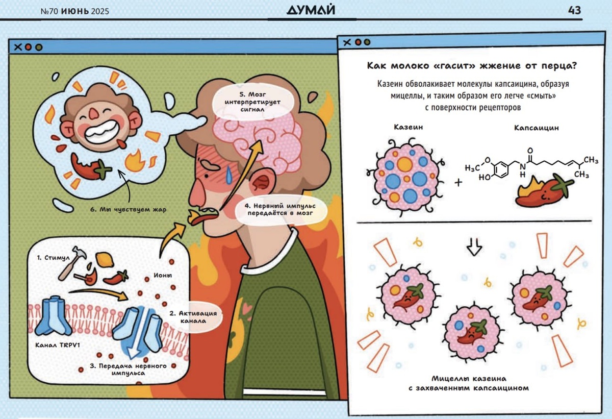 👅 Откуда берётся чувство тепла и жжения от перца? За восприятие высокой температуры отвечают особые каналы TRPV1 на поверхности нервных клеток. Они активируются и помогают передать в мозг сигнал «горячо!». Это природный механизм, который заставляет нас избегать ожогов. Почему же жжётся перец, если он не горячий сам по себе? Дело в том, что в нём содержится капсаицин, - вещество, молекулы которого из-за своей формы способны взаимодействовать с каналами, активируя их. Обманутый мозг считает, что раз каналы активированы, значит, температура высокая. Возникает чувство жжения. 🔥 Но «пожар», вызванный капсаицином, не потушить водой, какой бы холодной она ни была. Капсаицин практически не растворяется в воде, поэтому «смыть» его не получится. А вот жиры и белок казеин, содержащиеся в молоке, наоборот, связываются с молекулами капсаицина и помогают растворить его. Казеин обволакивает молекулы капсаицина, образуя мицеллы, и таким образом его легче «смыть» с поверхности рецепторов. 🍬 Ещё у