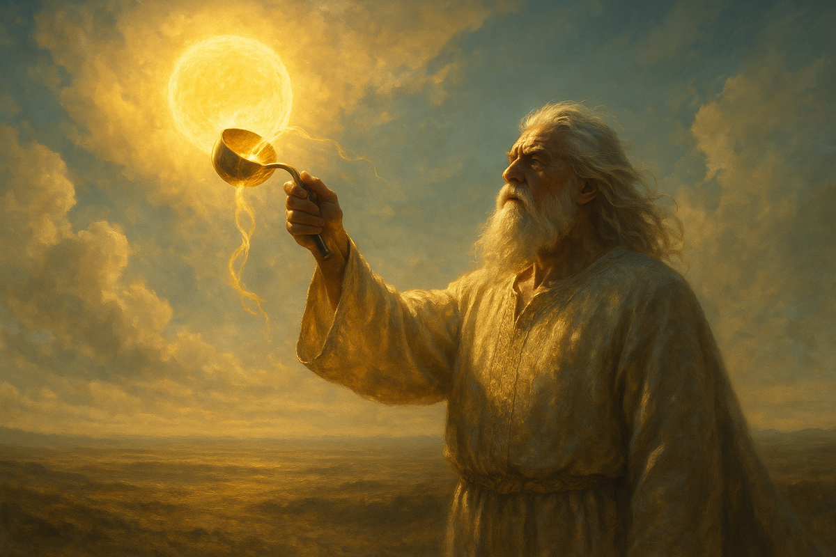 Тогда Сварог решил наделить Явь огнём благодати. Не грозовым пламенем и не слепящим заревом, но животворящим теплом, что не жжёт, но греет, не сжигает, но будит. Он поднялся к небу, выше круга солнца Хорса, и протянул свой ковш к самому его телу, намереваясь зачерпнуть частицу его огня и принести на землю. Он работал осторожно, чтобы не разлить сияющее золото, чтобы жар не обратился яростью. В его воображении уже вспыхивали будущие очаги, которые согреют всё живое. Сияющий язык пламени спустился с небес, словно золотой поток, и коснулся каменистой равнины.