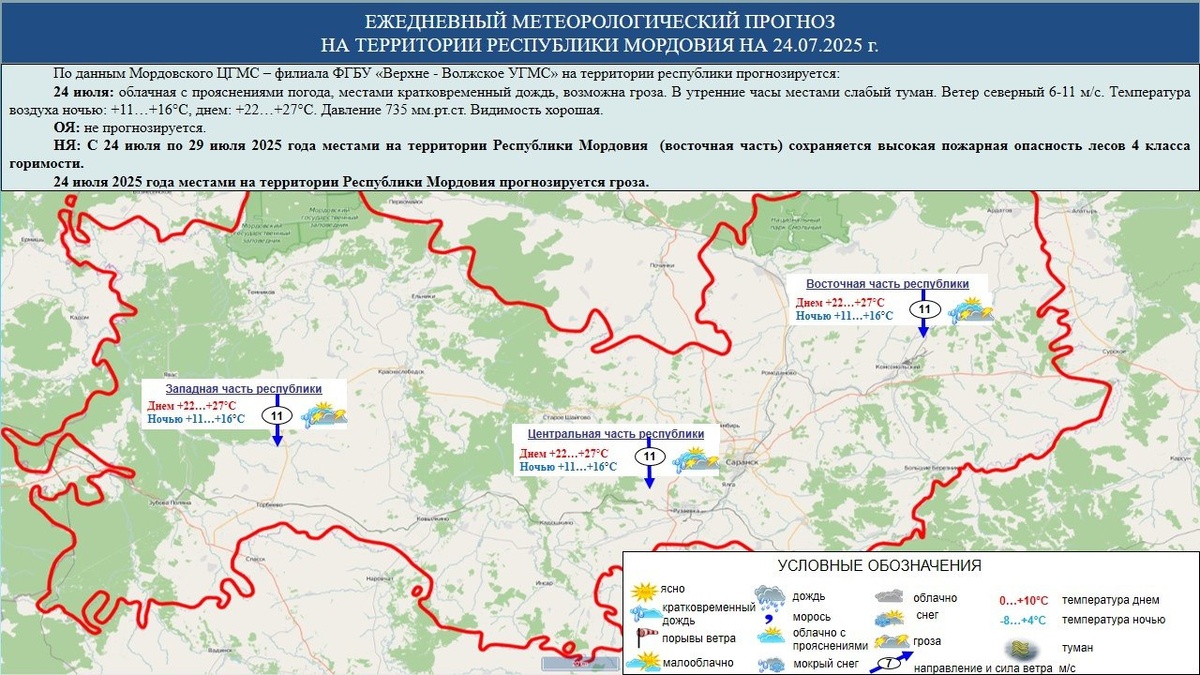 ☁️⛅⛈️ 24 июля в Мордовии облачная с прояснениями погода, местами кратковременный дождь, возможна гроза. В утренние часы местами слабый туман. Ветер северный 6-11 м/с. Температура воздуха ночью: +11…+16°C, днем: +22…+27°C. Давление 735 мм рт. ст. Происшествия | Подписаться | Предложить новость