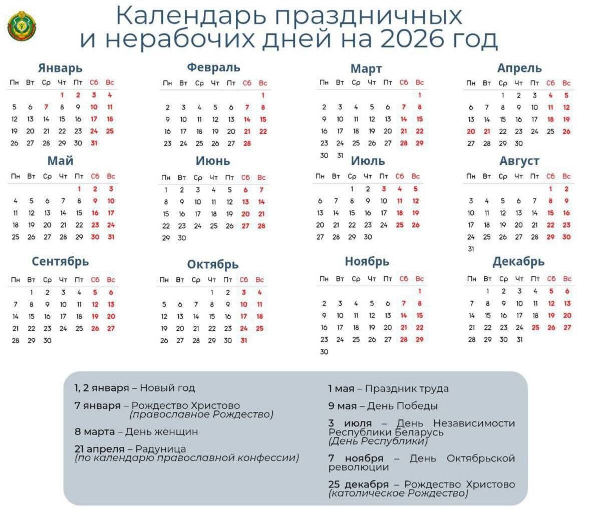 🗓️Правительство утвердило переносы рабочих дней на 2026 год 📌 Подписано Постановление Совета Министров Республики Беларусь от 22.07.2025 № 397 🔄 В 2026 году переносим и отдыхаем: 🔹20 апреля (понедельник) ➡️ на субботу 25 апреля. И получаем целых 4 выходных подряд: 18 (сб), 19 (вс), 20 (пн) и 21 (вт) 🤩 Важно: организациям и предприятиям разрешено переносить этот рабочий день на другую субботу, если это необходимо 😉 ☀️ Нерабочие праздничные дни 2026: ❄️ 1 и 2 января – Новый год ❄️ 7 января – Рождество Христово (православное) 🌷 8 марта – День женщин 🙏 21 апреля – Радуница 🥳 1 мая – Праздник труда 🎖️ 9 мая – День Победы 🇧🇾 3 июля – День Независимости ✊ 7 ноября – День Октябрьской революции 🎄 25 декабря – Рождество Христово (католическое) 🚀 Сохраняйте себе, чтобы не забыть.