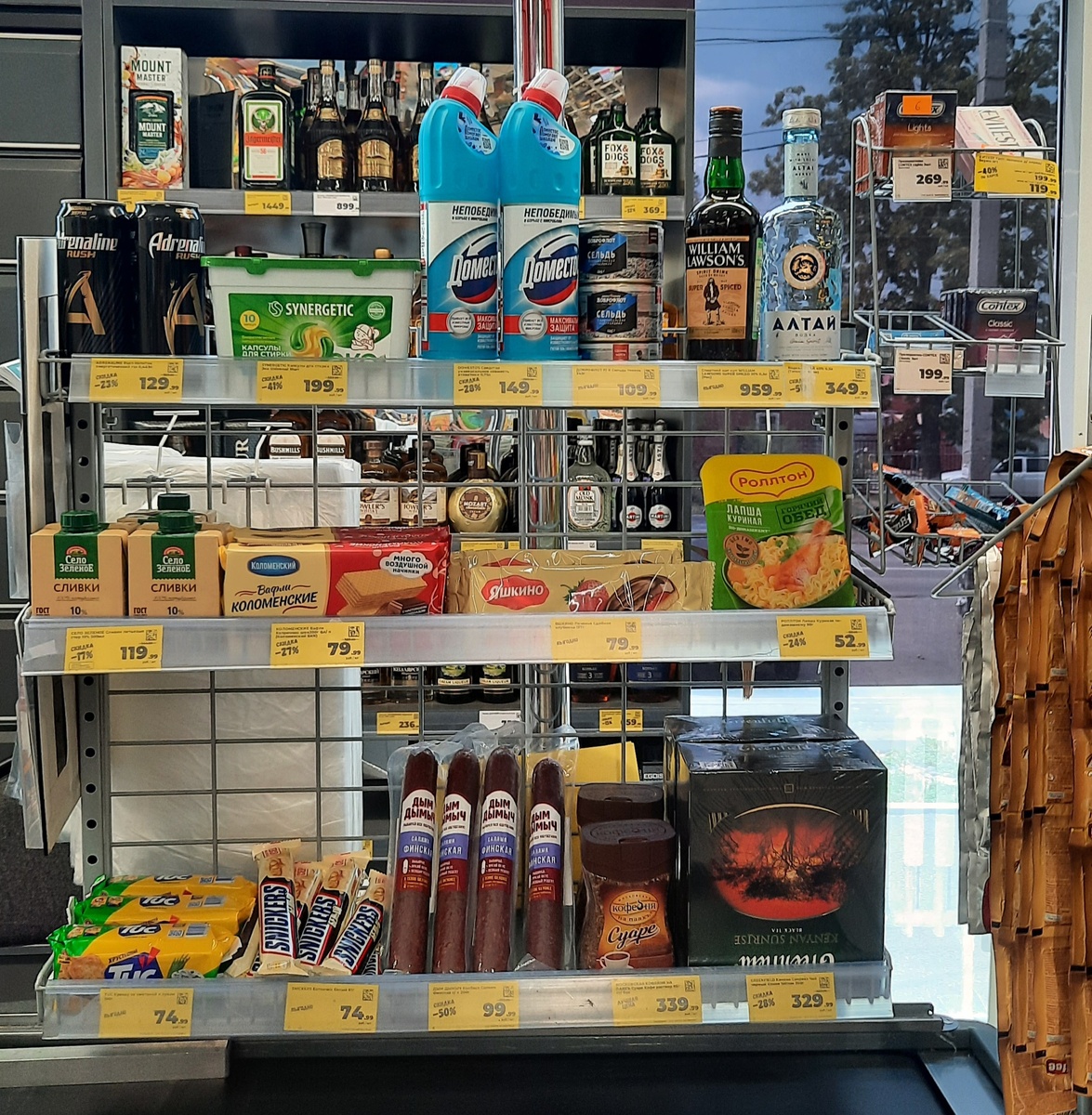 Всех приветствую , мои дорогие друзья и подписчики . Покажу вам товары со скидкой у кассы в Магните у дома. Магазин находится по адресу Ростовская область , Зерноградский район , станица Мечетинская , улица Ленина ,50 Напиток энергетический Adrenaline Rush газированный 0.449 л цена со скидкой по карте 129.99 рублей . Капсулы для стирки Synergetic Эко Universal 10 штук цена со скидкой по карте 199.99 рублей . Средство универсальное Доместос свежесть Атлантики 0.75 л цена со скидкой по карте 149.90 рублей . Сельдь тихоокеанская натуральная Доброфлот 245 г цена 109.99 рублей . Спиртной напиток купажированный William Lawsons Super Spiced 35 % 0.5 л цена 959.99 рублей. Водка Алтай 40 % 0.5 л цена со скидкой по карте 349.99 рублей. Лапша куриная по-домашнему Роллтон 90 г цена со скидкой по карте 52.99 рублей. Печенье сдобное Яшкино клубника 137 г цена 79.99 рублей. Вафли Коломенские Каприччо шоколадные 200 г цена со скидкой по карте 79.99 рублей. Сливки питьевые Село Зеленое стерилиз