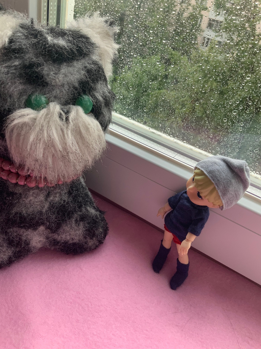 Котенок Гав и Томми смотрят на дождь. ☔️ Этот плюшевый котенок из детства. Вообще-то, у него не было имени. Или имя было, но я никак не могу его вспомнить. А сегодня я подумала, что его могут звать Гав. 🐶 Несмотря на то, что на котенка Гава из мультфильма он не похож.