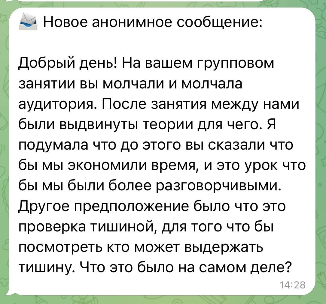 📨 Ответ на анонимное сообщение: Спасибо за вопрос. Никакой проверкой тишиной. Ваша группа только формировала матрицу, и это был важный этап в борьбе с тревогой и страхом перед тем, что вот-вот развернется на группе. Хотя в давно рабочей группе молчание может означать многое. К примеру: 1. Глубинный контакт — когда слова уже не нужны, а понимание происходит на другом уровне. 2. Сопротивление — группа избегает болезненной темы, "замирая" в надежде, что она исчезнет. 3. Переработку — участники "переваривают" услышанное, готовясь к новому витку обсуждения. 4. Скрытый диалог — напряжение, которое пока не может быть выражено словами. 5. Отдых — передышка после интенсивной эмоциональной работы. В вашем случае это было первое групповое дыхание — момент, когда коллектив учится быть вместе даже в тишине. И это уже огромный шаг. Моя интерпретация о времени и ее ценности, по моим ощущениям, помогла вам «очнуться» и начать рефлексировать свое состояние. С теплом к своим группам и их участник