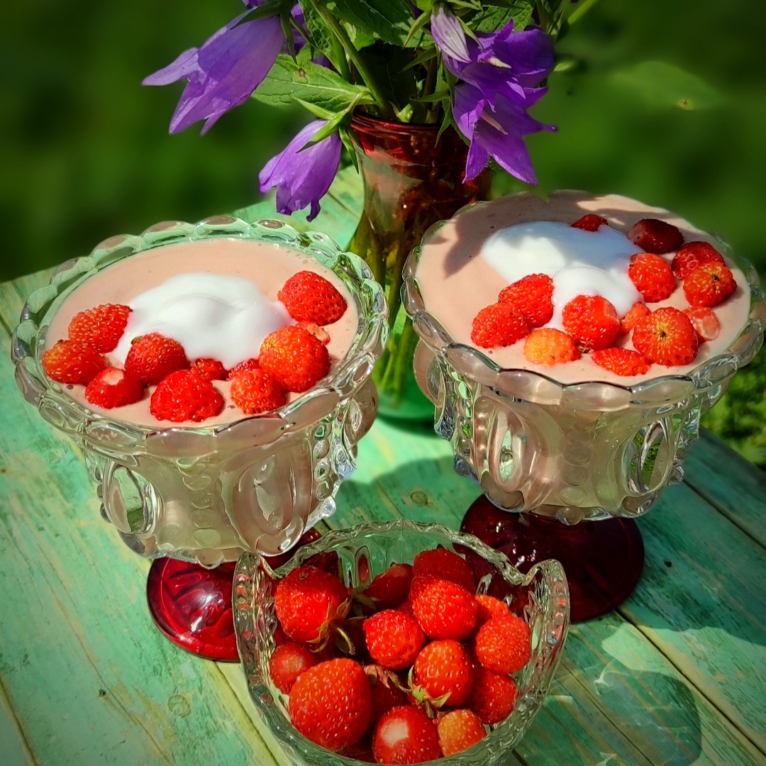 Рецепт абсолютно классический с небольшими вариациями. ⠀ Перемалываю в блендере все ингредиенты до однородной консистенции. ⠀ Вкладываю в бокалы, украшаю земляникой. ⠀ Урбеч чуть развожу в теплой воде и поливаю сверху.