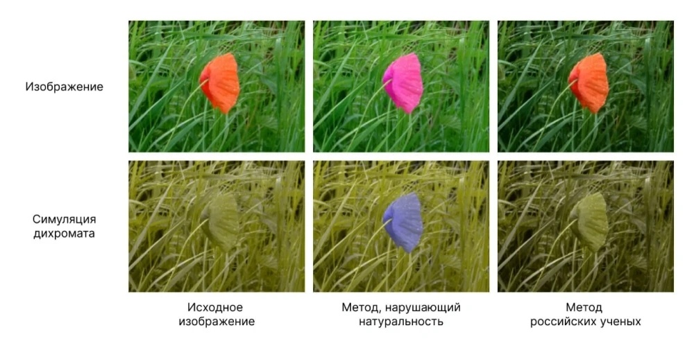 Российские исследователи из компаний Smart Engines, ФИЦ ИУ РАН и ИППИ РАН разработали новаторскую методику обработки изображений для телевизоров, которая успешно учитывает цветоощущение зрителей. Это уникальное достижение позволяет одинаково комфортно наслаждаться просмотром телевизора как людям с дальтонизмом, так и тем, у кого зрение не имеет отклонений. Ключевая особенность метода заключается в том, что он не искажает изначальную цветовую палитру изображения: предметы остаются в натуральных и узнаваемых цветах для трихоматиков (людей с обычным зрением), в то время как дальтоники могут лучше распознавать важные детали изображения. Технология основывается на моделировании зрения дихроматов, типичной формы дальтонизма. Сначала система проводит тщательный анализ изображения, выявляя элементы, которые могут вызывать затруднение в восприятии для людей с нарушениями цветоощущения. Затем она адаптирует такие фрагменты, изменяя их яркость и усиливая контраст, не изменяя при этом другие цвета