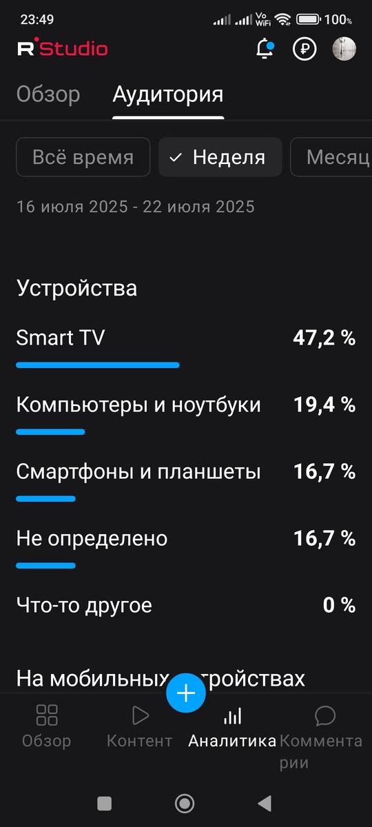 Удивительные данные по просмотрам наших видео на Рутуб. Почти половина просмотров приходится на Смарт ТВ. Кстати, такая же динамика и у Ютуб. Телефоны, как устройства просмотра видео контента уходят в прошлое. [Клуб Успешных Художников: VerbArt Top 100]