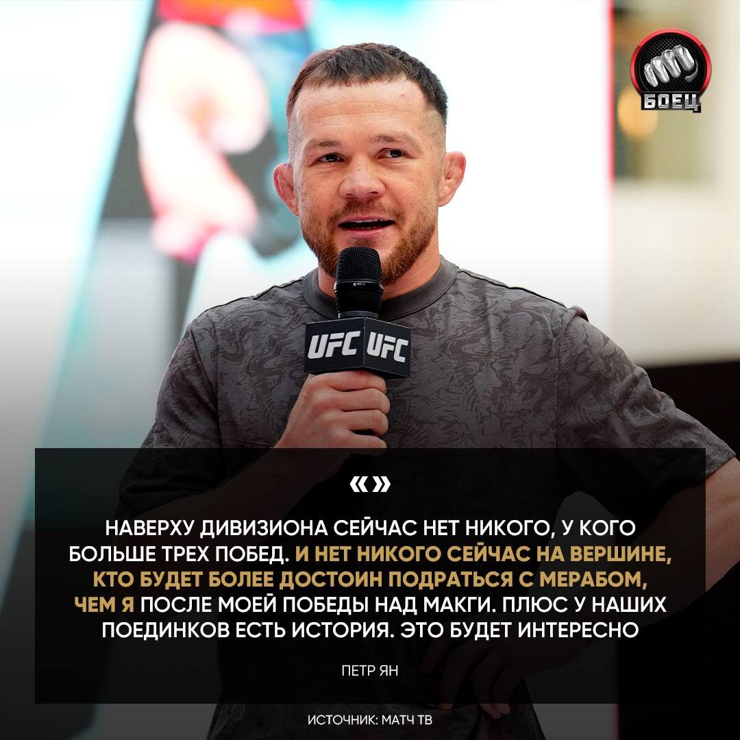 ⚡ Петр Ян уверен, что если он победит Макги, то будет достоин титульного реванша с Двалишвили 🏆 И Петр верит, что может одолеть Мераба: 🗣 Я верю, что могу победить. Мне интересен этот поединок, мне интересен этот реванш. Надеюсь, что он случится. Думаю, победить его можно за счет своего разнообразия, за счет умения навязывать, переламывать ход поединков. В интервью Матч ТВ Ян рассказал о своей подготовке к бою на турнире в Абу-Даби, возможном поединке с Умаром Нурмагомедовым и идее снять о себе фильм 🔥 Читайте полную версию на сайте 🤛