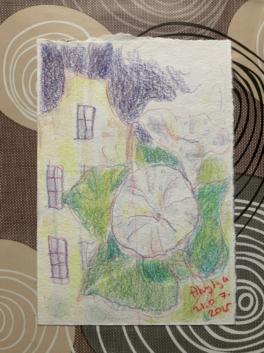 Следуя советам импрессионистов, я решила нарисовать все тот же (или просто схожий) сюжет с ипомеей в дождь и старыми домиками.