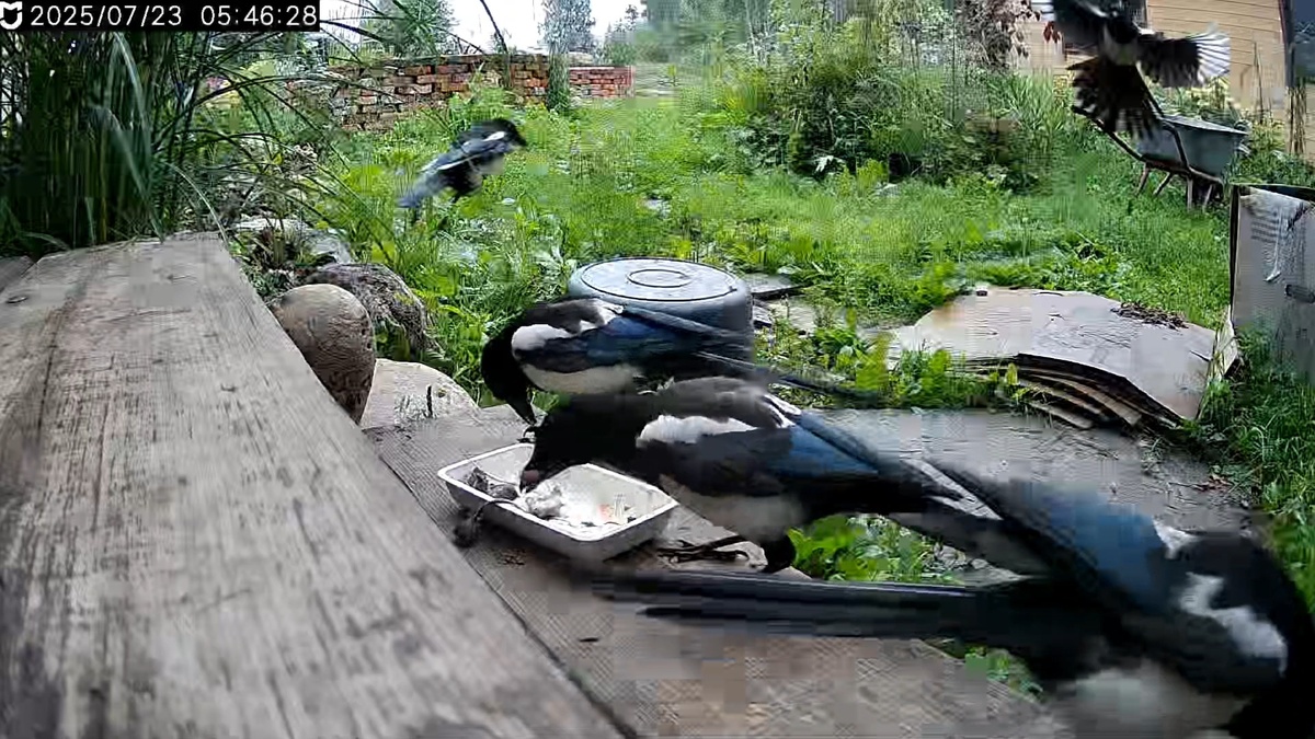 Толпа сорок опустошила мисочку с мясами за минуту и разочарованно разошлась