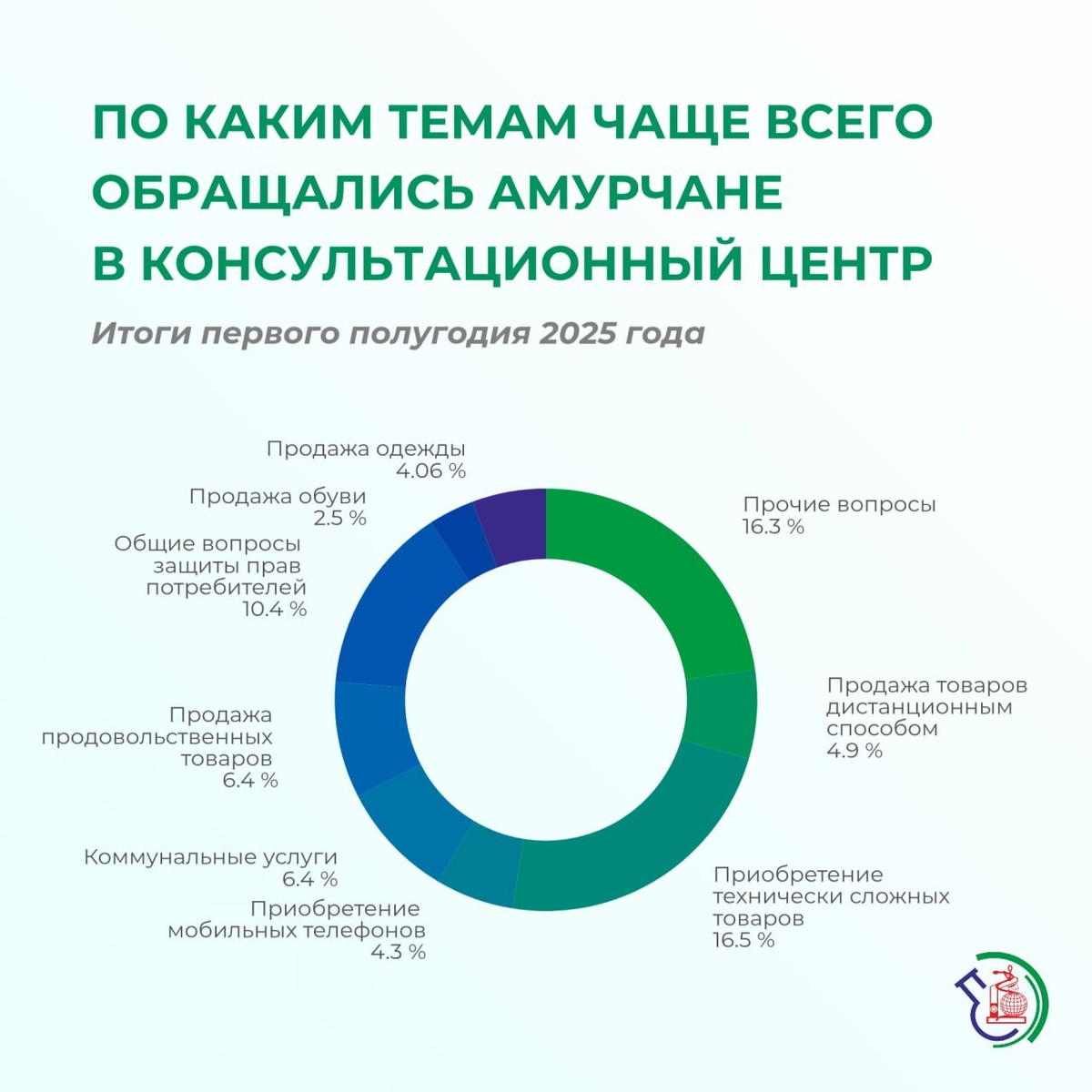 💬Чаще всего амурчане обращаются с вопросами о приобретении технически сложных товаров: Консультационный центр по защите прав потребителей подвел итоги за 6 месяцев К таким товарам, например, относятся компьютеры, ноутбуки, телевизоры, холодильники, автомобили (полный перечень товаров утвержден Постановлением Правительства РФ). Доля консультаций по особенностям продажи и возврата технически сложных товаров составила 16,5% от общего числа обращений В топе также общие вопросы защиты прав потребителей (10,4%): специалисты разъясняли статьи Закона «О защите прав потребителей», оказывали помощь по составлению претензий и консультации по предсудебному делопроизводству, сроках претензионной работы Остальные консультации по вопросам потребительского законодательства: • коммунальные услуги (6,4%) • продажа продовольственных товаров (6,4%) • продажа товаров дистанционным способом (4,9%) • приобретение мобильных телефонов (4,3%) • продажа одежды (4,5%) и обуви (2,5%) Совокупно около 30%