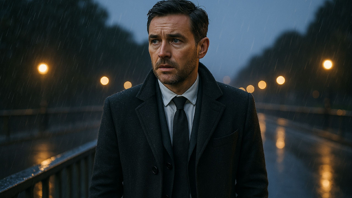 За перилами стояла одинокая фигура, словно вытесненная из реальности дождём и ветром. Её силуэт почти терялся в пелене дождя — тонкий, как штрих на мокром стекле. Она стояла, будто вкопанная, в лёгкой куртке. Волосы, тёмные и мокрые, прилипли к щекам, закрывая половину лица. Ни зонта, ни капюшона. Казалось, она стояла здесь давно. И всё, что у неё осталось — это эти ржавые перила под пальцами. Руки её были побелевшими от напряжения, она вцепилась в металлический прут так, будто тот действительно мог удержать её от падения — или, наоборот, стать ступенью в небытие. Её поза не была панической — скорее, тихо обречённой.