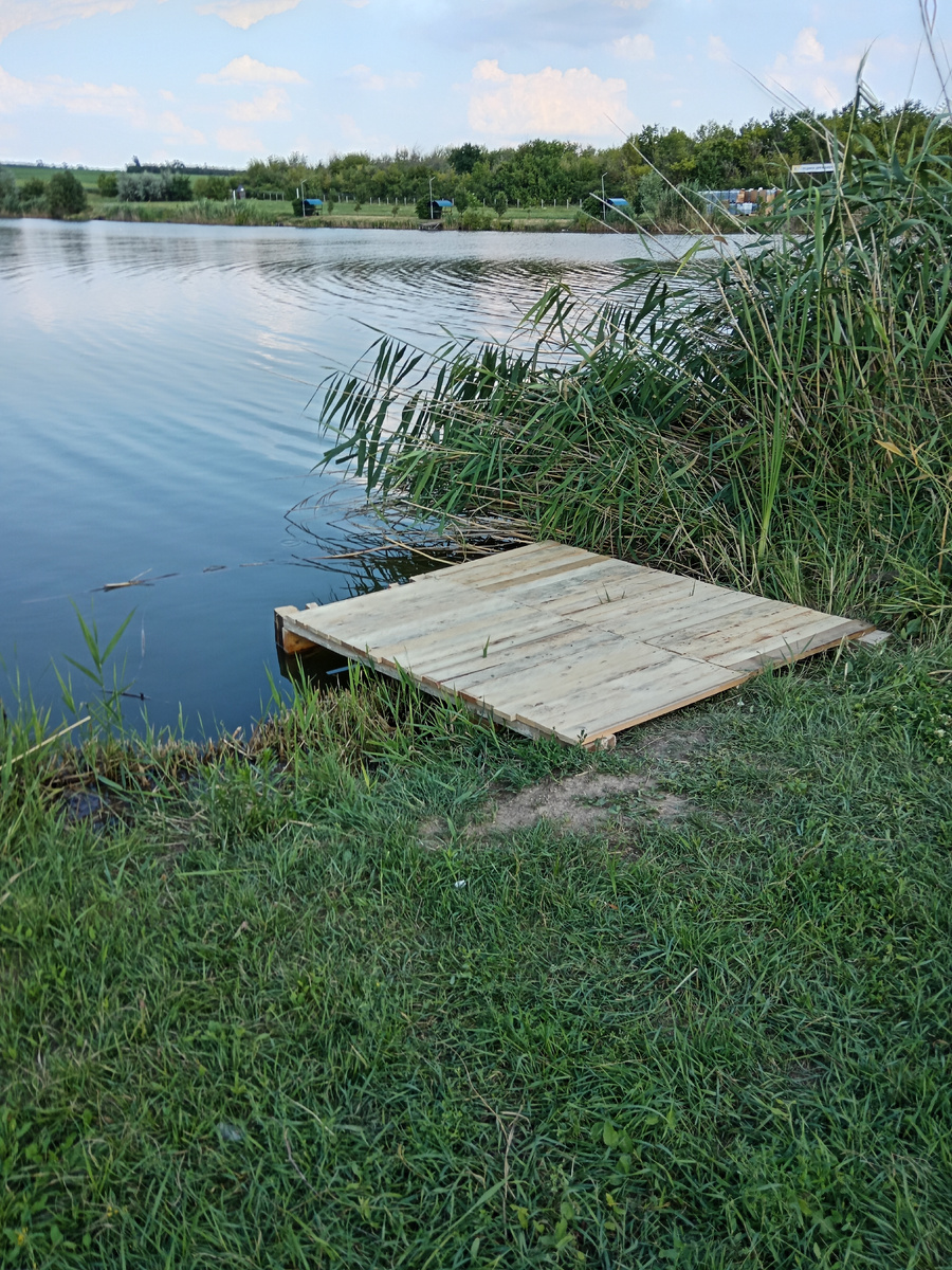 Пруд Лакокраска 16 июля 2025. И снова тот же сектор. Правда я без своих удилок, осталась Санины сторожить, а парни во главе с дядей Юрой строили кладку в секторе, который я назвала одуванчик. По-моему звучит хорошо. Прикольно даже -Привет ты где? -Я в секторе одуванчик😁 Голову кажется мне сегодня напекло. Но название это мне нравится. Кладку сделали широкую удобную. Я сходила там попрыгала мне понравилась. И даже лесенку там сделали. Вдруг за рыбой в воду зайдёт кто. Или вдруг окунуться в такую жару кто-нибудь захочет. Удобно вообщем. И на этом секторе где ива растёт,на той кладке, где я свой род под ставлю тоже мне лесенку сделали. Ура! Я сегодня снова плавала и лесенку испытала. Хорошо держится. Старый поддон справа, который был убрали, потом расширят и эту кладку. И на этой кладке где Санин род под будут расширять кладку. Мне это нравится, люблю, когда удобно. А рыбе жарко не хочет она ловится. Включил дядя Юра уже сегодня аэратор. А штиль полнейший, так о